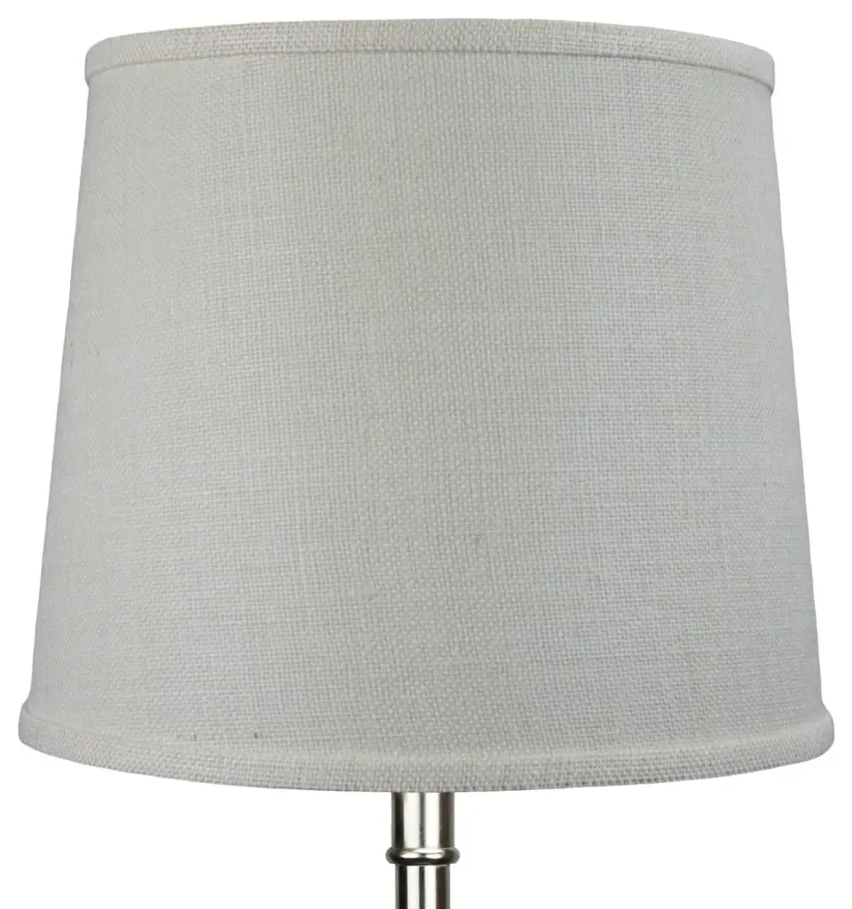 Urbanest French drum lampshade in denim blue burlap is a way to add textural light to any space. The top diameter measures 12" across, the bottom diameter measures 14" across, and 10" overall height. Spider harp fitter works with most standard harps and lamp bases. Bulb not included.