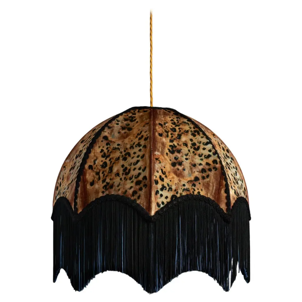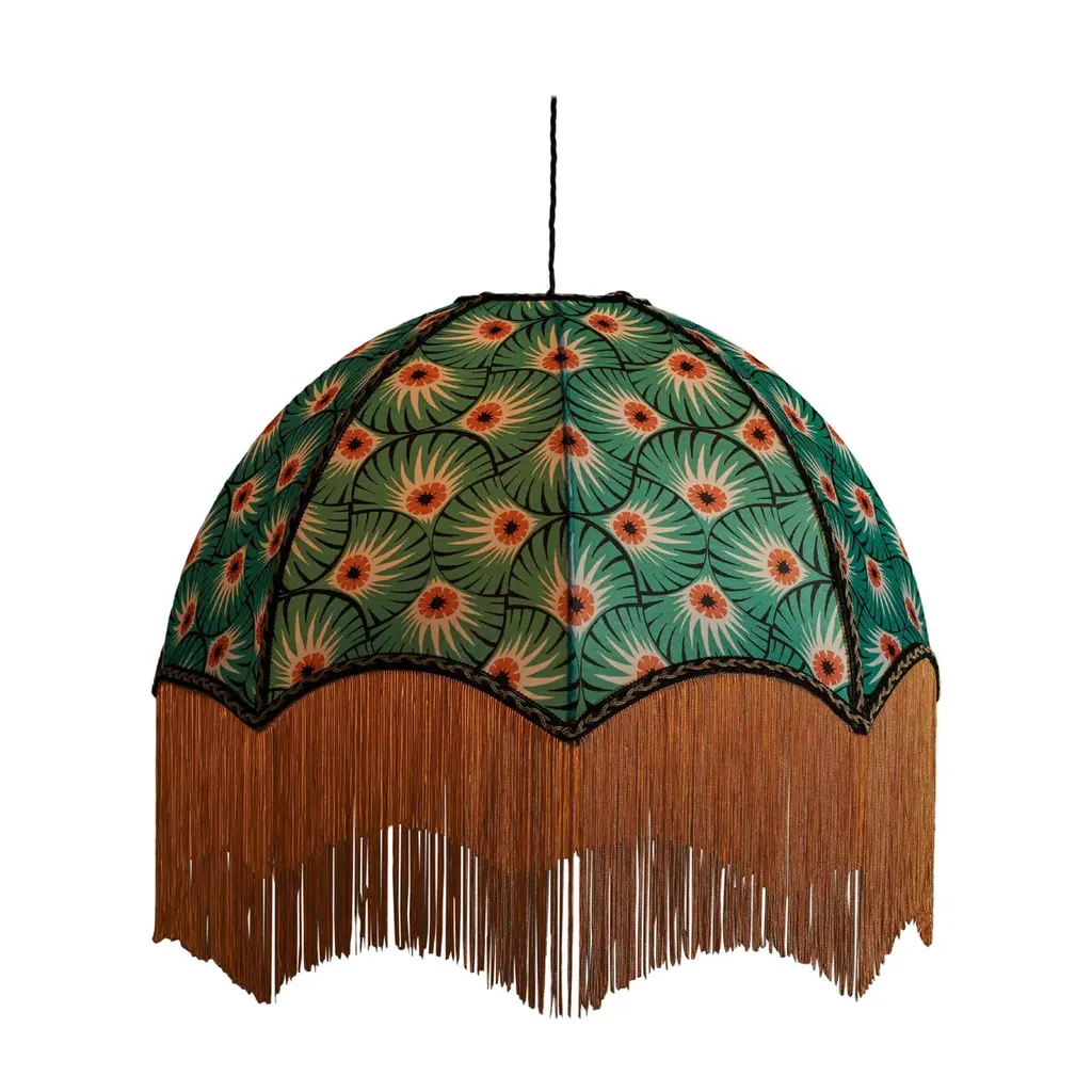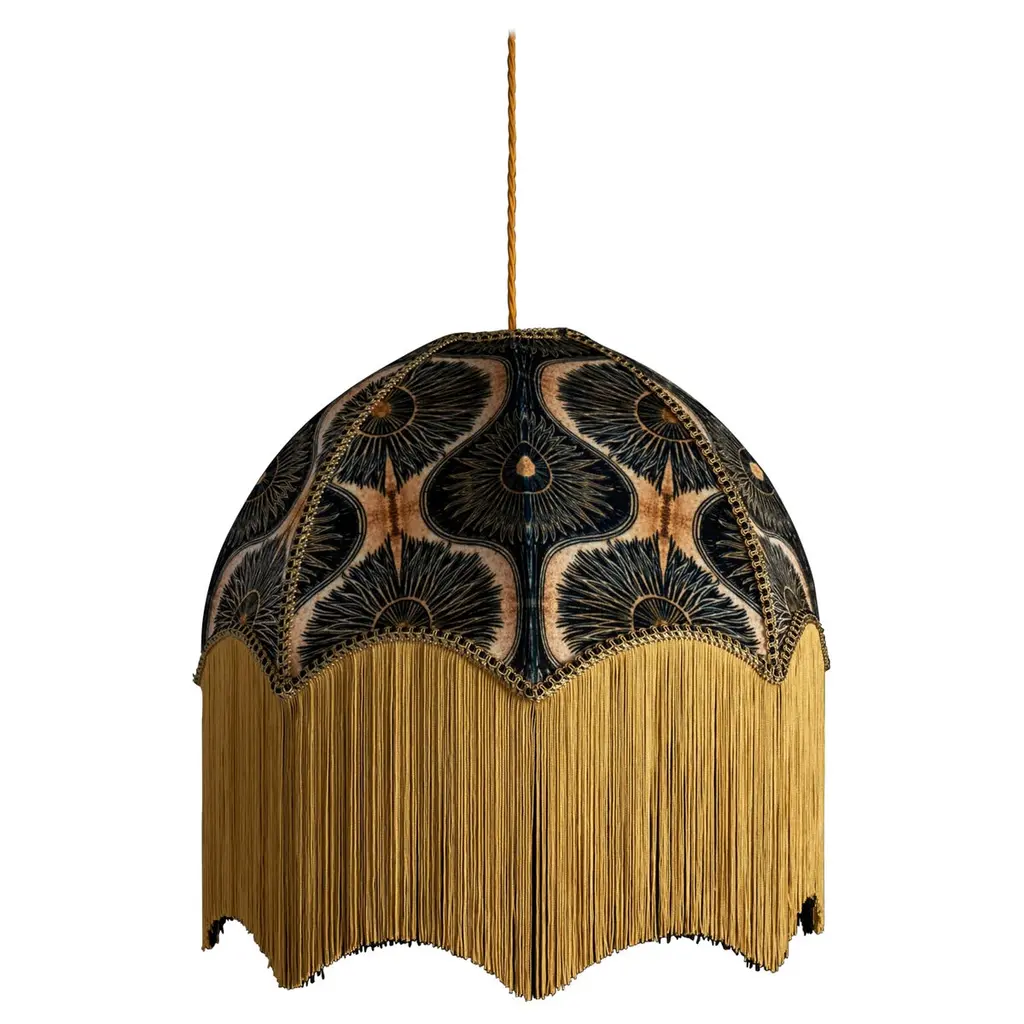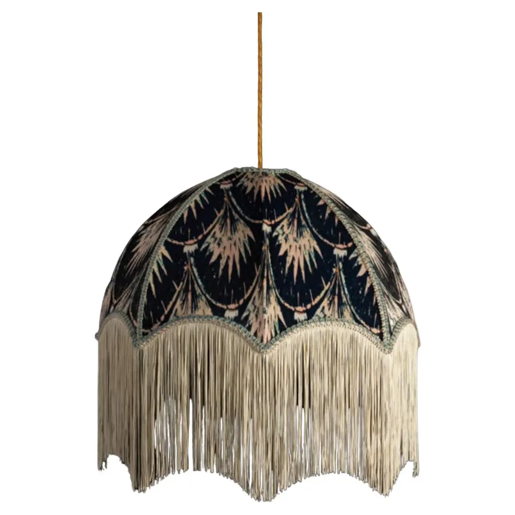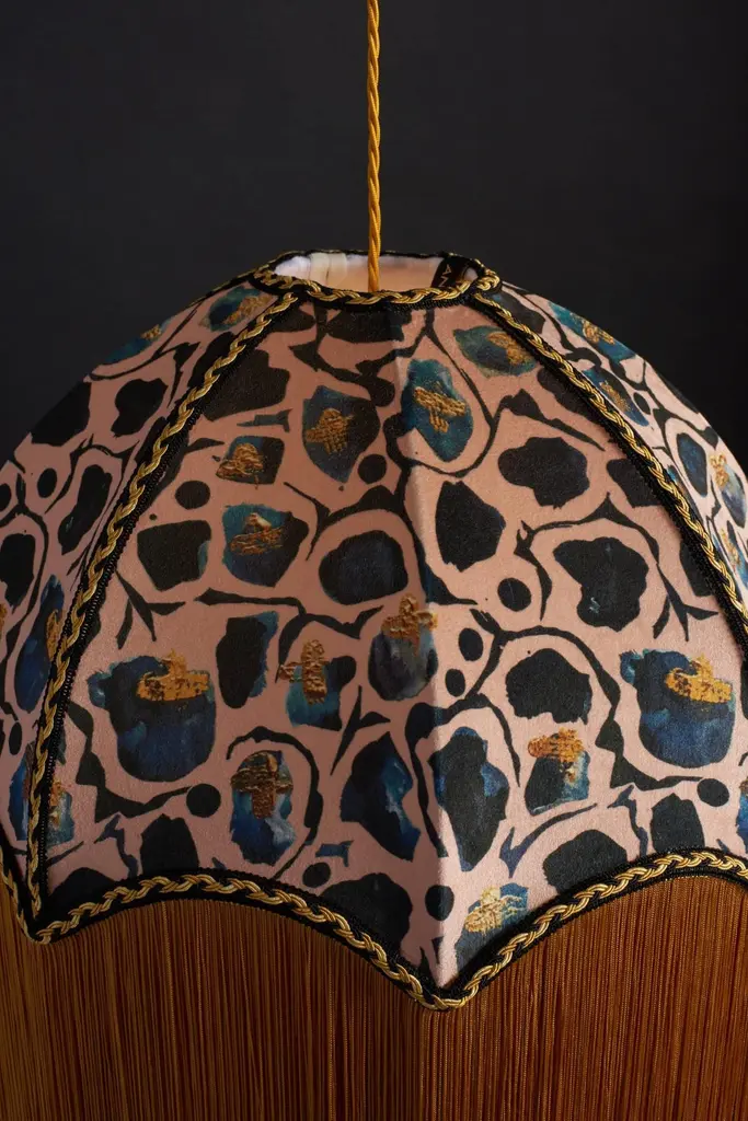 Giraffe is our fun animal print created from an ink painting. Anna added gold touches to deep inky blue tones, setting them on a blush pink background.Anna Hayman lampshades create a fantastic centrepiece to a room and work as well on a lamp base as they do as pendants, especially now we are able to offer gold linings. Treat yourself to a beautiful piece of artistry, all made in the UK.Every piece is handmade to order and takes 5-7 weeks to be made and delivered. A piece for your interior to treasure and delight in, these emit a soft glow which lights up a room so beautifully.The Duchess satin lets more light through than the velvet, as does the white lining rather than the gold. You can use a higher wattage/lumen strength bulb if you’d like the heavier velvet fabric.The dimensions are below – please bear in mind fringe colour/length is able to be altered easily as is the braid trim. Do email us for alternative options.Frame Diameter: 16"Frame Height: 9.5"Fringe Length if Pendant Fitting: 8"Fringe Length if Lamp Base Fitting: 6"Flex and fitting are not included.The attachment for your lamp or pendant fitting is included – choice of lamp or hanging pendant attachment, these are both adjustable for UK or Euro (E27) fittings, as well as US E26. Email us if you’d like further information on this.