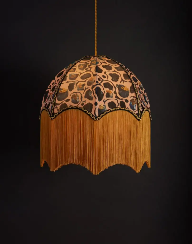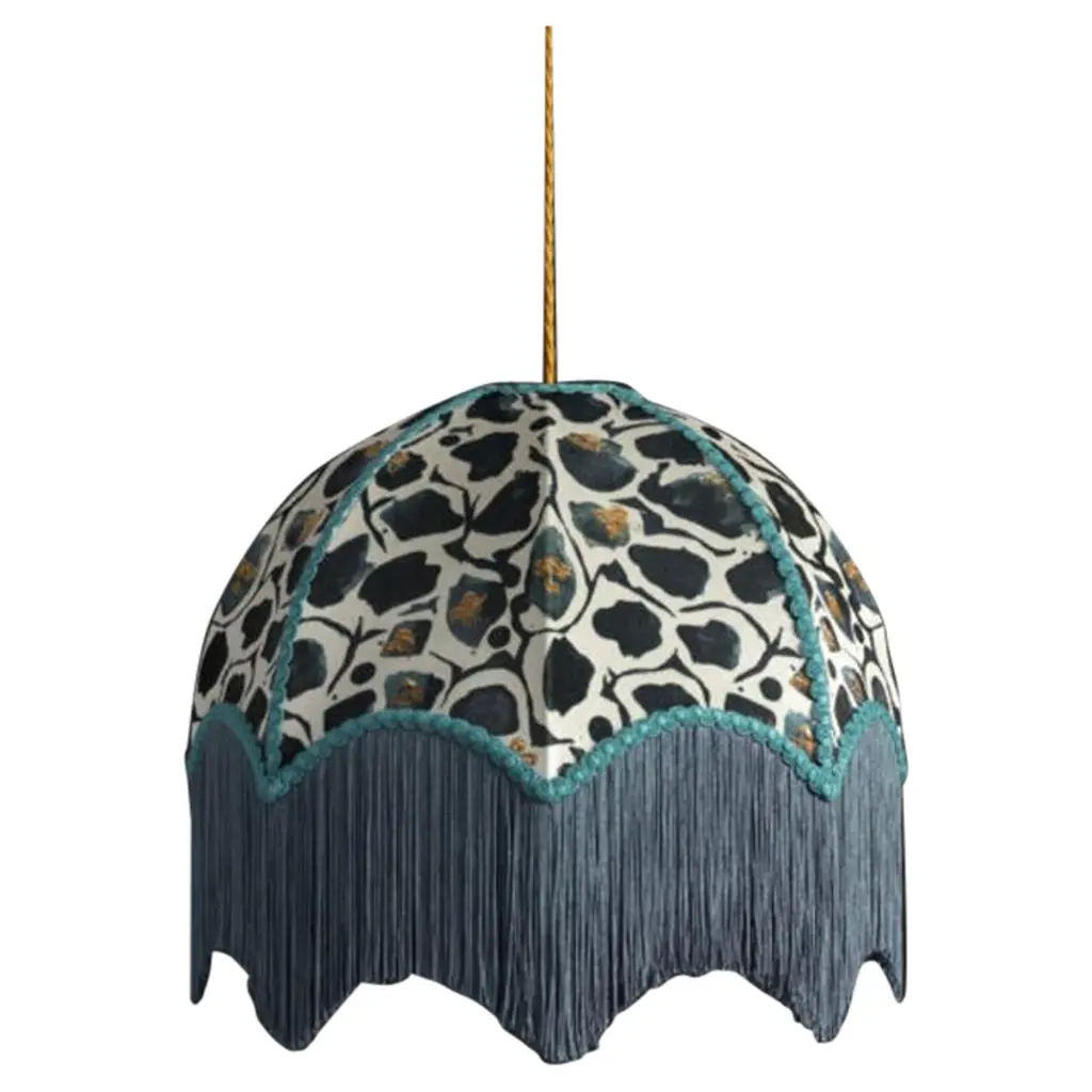 Giraffe is our fun animal print created from an ink painting. Anna added gold touches to deep inky blue tones, setting them on a blush pink background.Anna Hayman lampshades create a fantastic centrepiece to a room and work as well on a lamp base as they do as pendants, especially now we are able to offer gold linings. Treat yourself to a beautiful piece of artistry, all made in the UK.Every piece is handmade to order and takes 5-7 weeks to be made and delivered. A piece for your interior to treasure and delight in, these emit a soft glow which lights up a room so beautifully.The Duchess satin lets more light through than the velvet, as does the white lining rather than the gold. You can use a higher wattage/lumen strength bulb if you’d like the heavier velvet fabric.The dimensions are below – please bear in mind fringe colour/length is able to be altered easily as is the braid trim. Do email us for alternative options.Frame Diameter: 14"Frame Height: 6"Fringe Length: 6"Flex and fitting are not included.The attachment for your lamp or pendant fitting is included – choice of lamp or hanging pendant attachment, these are both adjustable for UK or Euro (E27) fittings, as well as US E26. Email us if you’d like further information on this.
