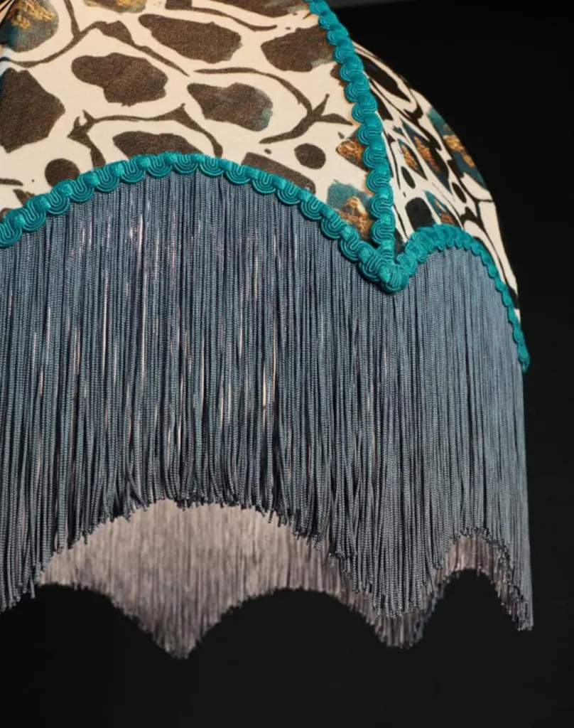 Giraffe is our animal inspired ink print. Hand painted by Anna this has beautiful petrol and grey tones on an off-white base. With gold accents this is a luxurious and opulent design which fits around many schemes.Anna Hayman lampshades create a fantastic centrepiece to a room and work as well on a lamp base as they do as pendants, especially now we are able to offer gold linings. Treat yourself to a beautiful piece of artistry, all made in the UK.Every piece is handmade to order and takes 5-7 weeks to be made and delivered. A piece for your interior to treasure and delight in, these emit a soft glow which lights up a room so beautifully.The Duchess satin lets more light through than the velvet, as does the white lining rather than the gold. You can use a higher wattage/lumen strength bulb if you’d like the heavier velvet fabric.The dimensions are below – please bear in mind fringe colour/length is able to be altered easily as is the braid trim. Do email us for alternative options.Frame Diameter: 18"Frame Height: 10.5"Fringe Length: 8"Flex and fitting are not included.The attachment for your lamp or pendant fitting is included – choice of lamp or hanging pendant attachment, these are both adjustable for UK or Euro (E27) fittings, as well as US E26. Email us if you’d like further information on this.