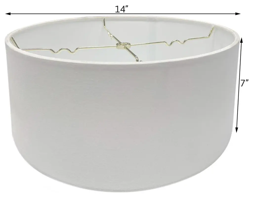 Home Concept Signature Shades feature the finest premium shantung fabric. Durable Upholstery-Quality fabric means your new lampshade will last for decades. It won''t get brittle from smoke or sunlight like less expensive fabrics. Heavy brass and steel frames means your shades can withstand abuse from kids and pets. It''s a difference you can feel when you lift it.FABRIC - Hard Back White Linen Fabric Drum Shape Lampshade with Top and Bottom Trim and inner liner.DIMENSIONS - 14" Top x 14" Bottom x 7" HeightFEATURES - Includes Spider with notches Fitter and 1" drop. Notches fit 6", 8", or 10" diameter glass bowls.QUALITY - Top shelf hardback lampshade found in better lighting showrooms. Durable Hotel quality shade.MODERN - Modern shallow drum style will upgrade your existing lamp.