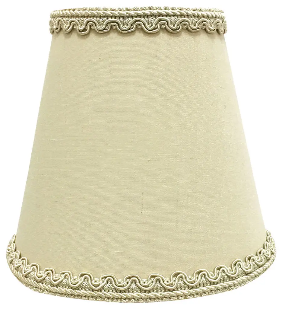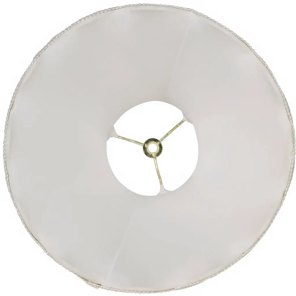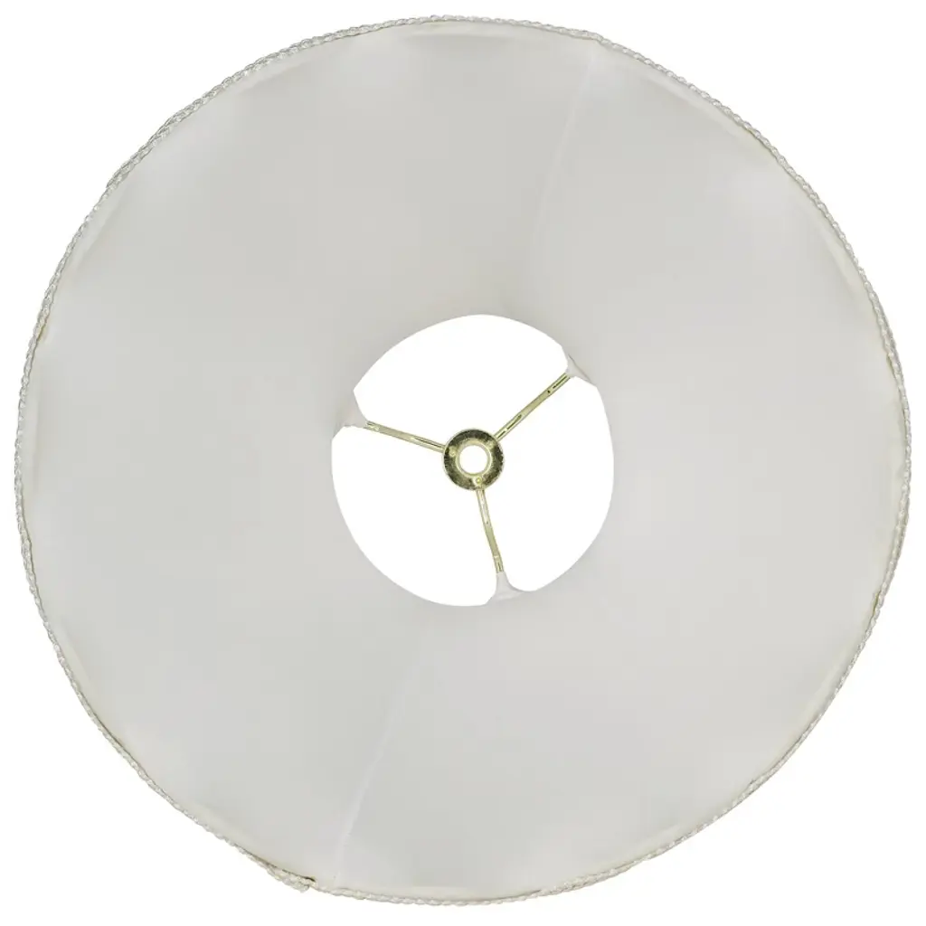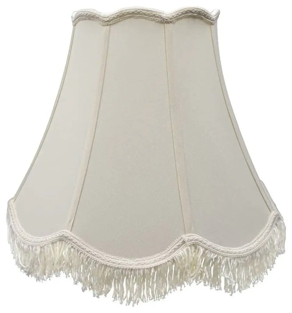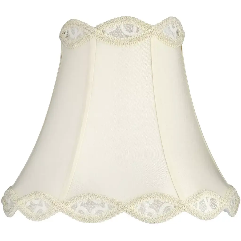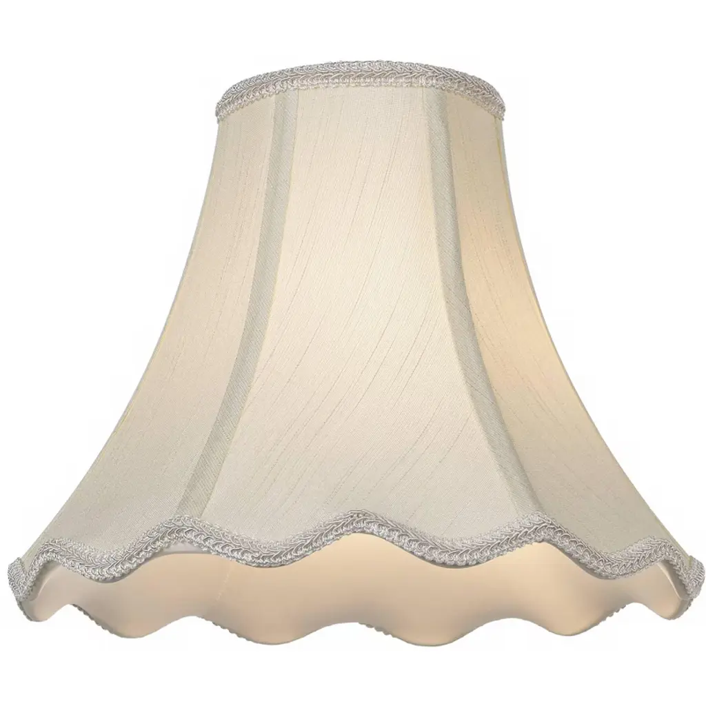 The traditional bell shade gets an update with a gentle scallop design at the top and bottom. Premium creme polyester outer fabric with matching braid trim and an inner poly/nylon blend lining. High quality hardware includes a polished bronze spider fitting with 1/2" drop. From the Springcrest Collection.