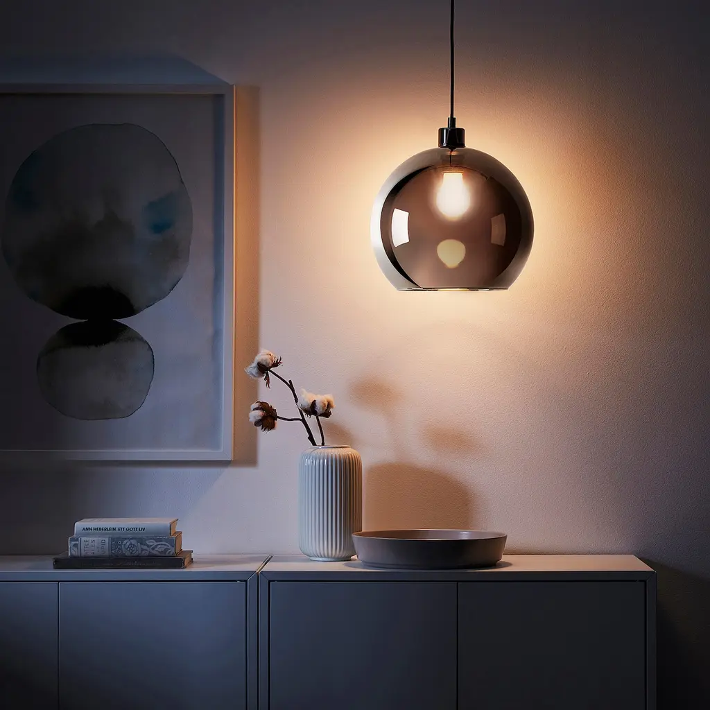 JAKOBSBYN Pendant lamp shade - silver color 12 ". These lampshades in glass are mouth blown by a skilled craftsperson and therefore each shade is unique. Cord set is sold separately. Light bulb sold separately. You position the lampshade to hang straight by adjusting the cord set/cord.