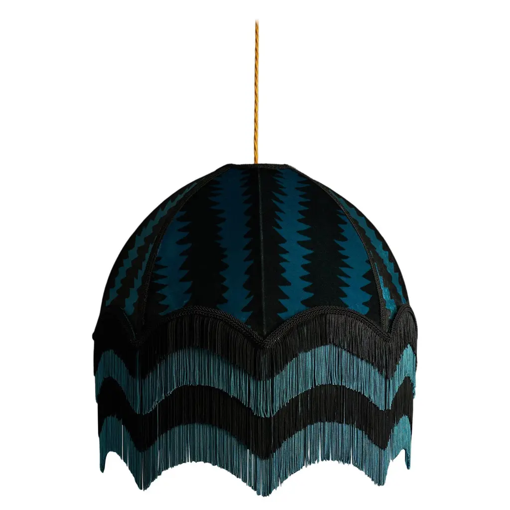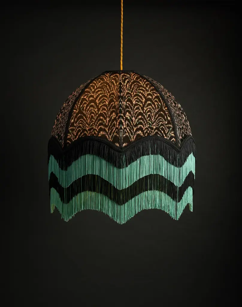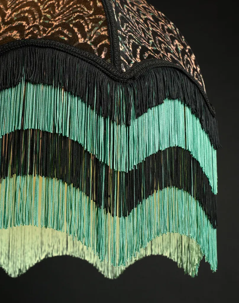 Josephine is an ink painted print with a deco edge. With hints of turquoise, pink and cream this design is shown off beautifully by the four layers of sea green and black alternating fringe.Anna Hayman lampshades create a fantastic centrepiece to a room and work as well on a lamp base as they do as pendants, especially now we are able to offer gold linings. Treat yourself to a beautiful piece of artistry, all made in the UK.Every piece is handmade to order and takes 5-7 weeks to be made and delivered. A piece for your interior to treasure and delight in, these emit a soft glow which lights up a room so beautifully.The Duchess satin lets more light through than the velvet, as does the white lining rather than the gold. You can use a higher wattage/lumen strength bulb if you’d like the heavier velvet fabric.The dimensions are below – please bear in mind fringe colour/length is able to be altered easily as is the braid trim. Do email us for alternative options.Frame Diameter: 18"Frame Height: 10.5"Fringe Length: 8" (4 layers at 2", 4", 6" and 8")Flex and fitting are not included.The attachment for your lamp or pendant fitting is included – choice of lamp or hanging pendant attachment, these are both adjustable for UK or Euro (E27) fittings, as well as US E26. Email us if you’d like further information on this.