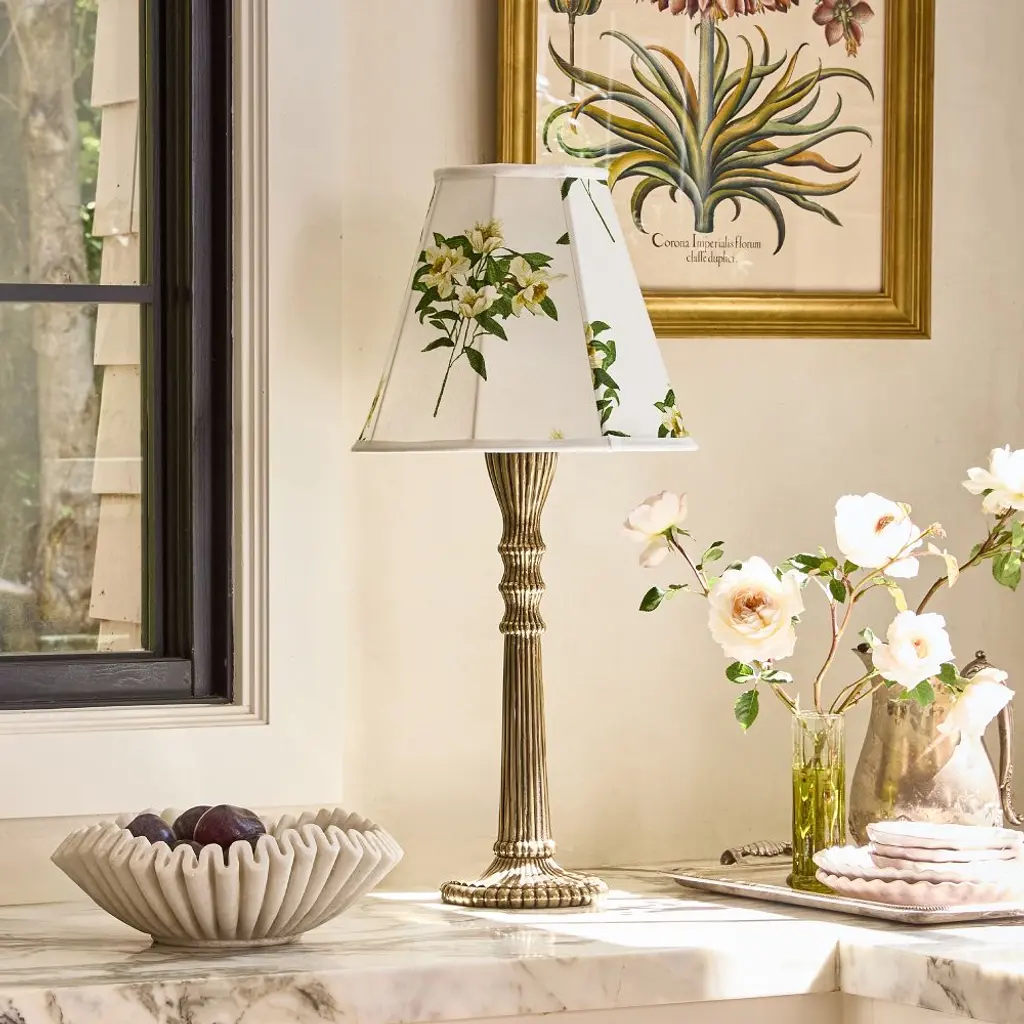 A garden, all aglow. In our best-selling Narcissus print, this 100% cotton shade covers a brass-plated steel frame. A structured style in soft florals.