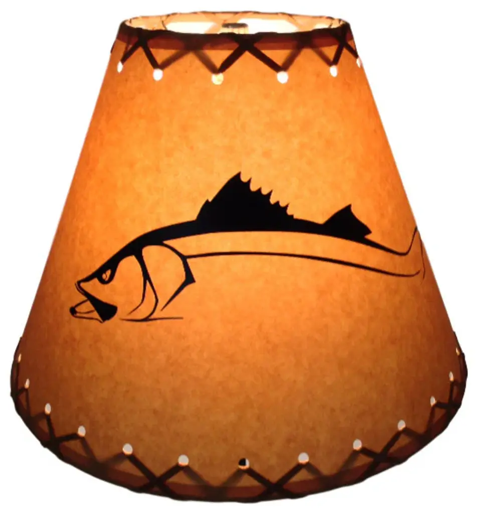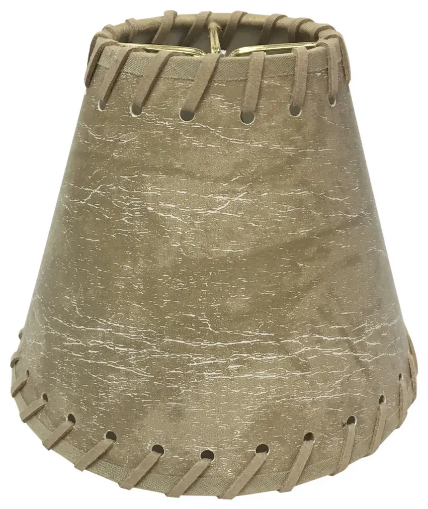Dimensions: 6 inch top, 10 inch bottom, 7.5 inch slant height.Fitter Type: Brass uno has a 1.5 inch drop into shade.Material: Parchment paper and faux leather stitched trim.Shape/Style: Classic empire design with a rustic edge.Application: Ideal replacement for uno downbridge lamp.Upgrade your uno lamp with this rustic oiled parchment lamp shade. Polished brass uno is threaded to easily screw on to lamp socket for installation above the downward facing bulb (typically for down-bridge lamps). Opening of Uno fitter measures 1.25 inches across and is recessed 1.5 inches into top of shade. This slight drop helps to conceal electrical attachments adding to the overall appeal of the shade. Shade measures 6 inches across the top, 10 inches across the bottom, 7.5 inch slant height. For best fit, measure your existing shade before purchase. The third dimension is the slant height of the whole shade, not the distance from bottom to fitter. Perfect size for floor or table lamp.