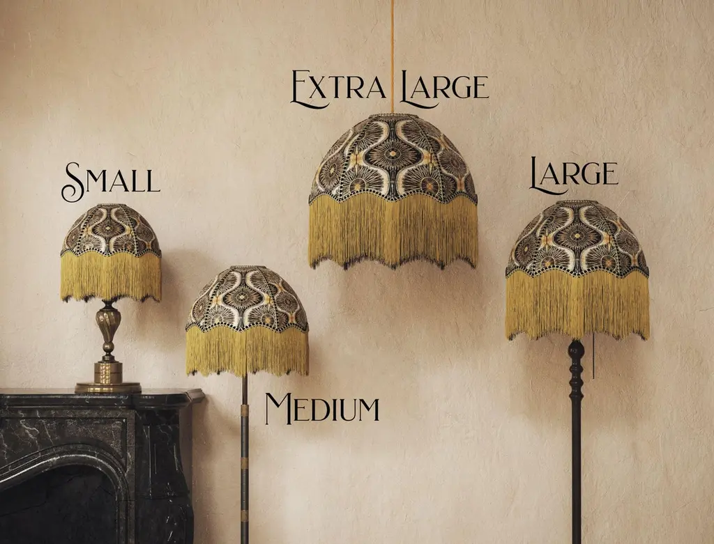 Oyster is our Art Nouveau inspired design, with an intricate and complex pattern in golds, soft blacks and a slightly purplish hue.Anna Hayman lampshades create a fantastic centrepiece to a room and work as well on a lamp base as they do as pendants, especially now we are able to offer gold linings. Treat yourself to a beautiful piece of artistry, all made in the UK.Every piece is handmade to order and takes 5-7 weeks to be made and delivered. A piece for your interior to treasure and delight in, these emit a soft glow which lights up a room so beautifully.The Duchess satin lets more light through than the velvet, as does the white lining rather than the gold. You can use a higher wattage/lumen strength bulb if you’d like the heavier velvet fabric.The dimensions are below – please bear in mind fringe colour/length is able to be altered easily as is the braid trim. Do email us for alternative options.Frame Diameter: 22"Frame Height: 12"Fringe Length: 8"Flex and fitting are not included.The attachment for your lamp or pendant fitting is included – choice of lamp or hanging pendant attachment, these are both adjustable for UK or Euro (E27) fittings, as well as US E26. Email us if you’d like further information on this.
