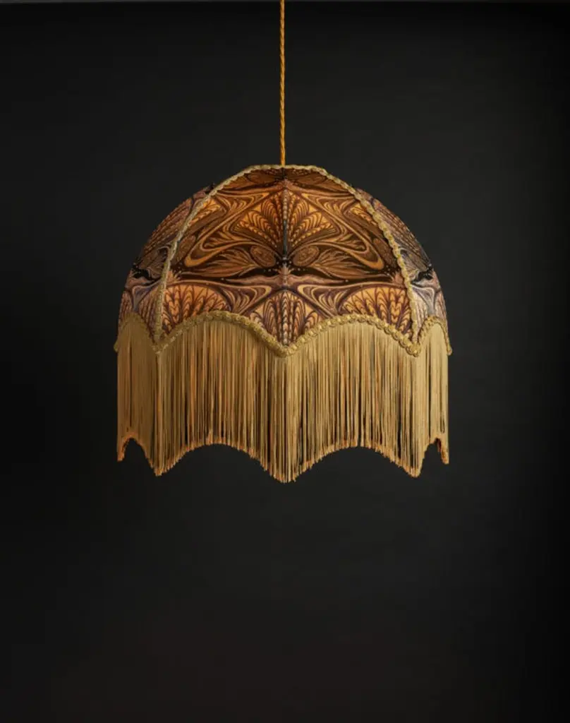 Oyster is our Art Nouveau inspired design, with an intricate and complex pattern in golds, soft blacks and a slightly purplish hue.Anna Hayman lampshades create a fantastic centrepiece to a room and work as well on a lamp base as they do as pendants, especially now we are able to offer gold linings. Treat yourself to a beautiful piece of artistry, all made in the UK.Every piece is handmade to order and takes 5-7 weeks to be made and delivered. A piece for your interior to treasure and delight in, these emit a soft glow which lights up a room so beautifully.The Duchess satin lets more light through than the velvet, as does the white lining rather than the gold. You can use a higher wattage/lumen strength bulb if you’d like the heavier velvet fabric.The dimensions are below – please bear in mind fringe colour/length is able to be altered easily as is the braid trim. Do email us for alternative options.Frame Diameter: 18"Frame Height: 10.5"Fringe Length: 8"Flex and fitting are not included.The attachment for your lamp or pendant fitting is included – choice of lamp or hanging pendant attachment, these are both adjustable for UK or Euro (E27) fittings, as well as US E26. Email us if you’d like further information on this.