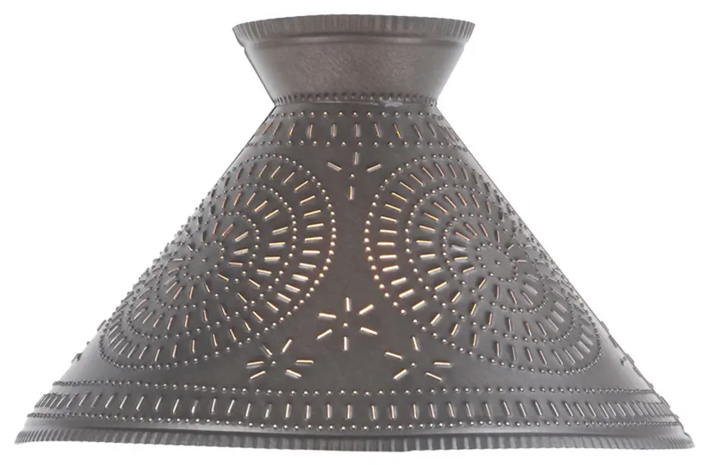 This primitive Metal Dot Dash Lamp Shade is reminiscent of antique ironwork of yesteryear. The shade is punched in the traditional dot/dash style that allows light to shine through creating a beautiful pattern. Perfect decoration piece for your living room, bedroom, study, or office.