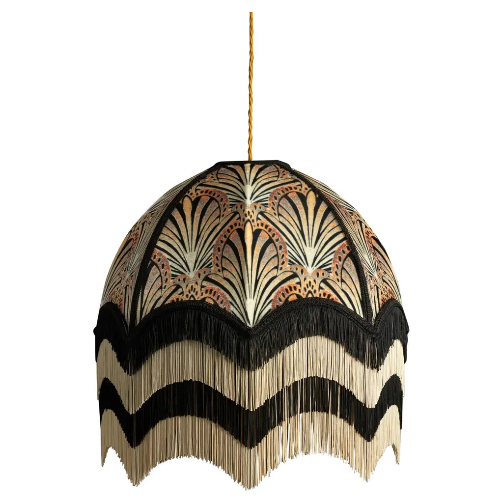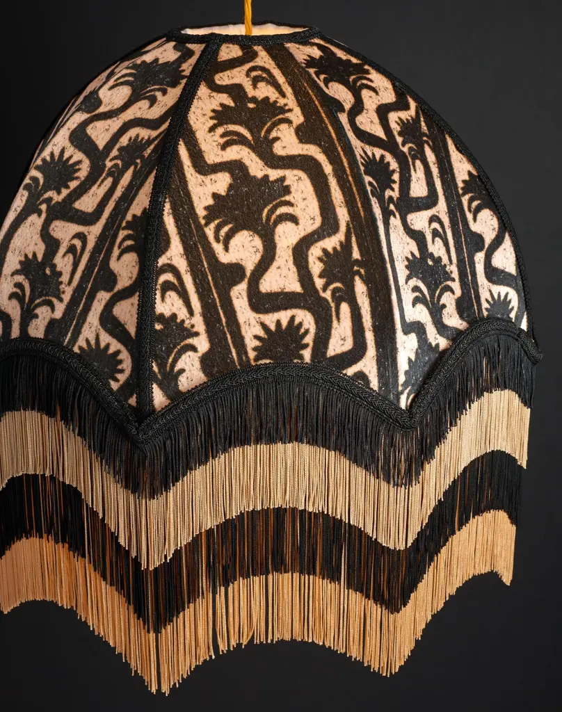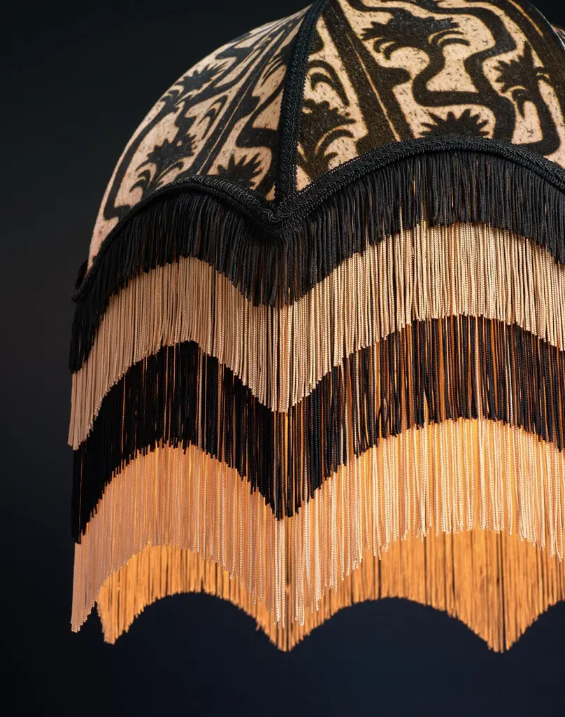 Puzzle was created as a linoprint which has been digitally worked into an offbeat meandering tree pattern. In tones of soft black and blush with four layers of decadent fringe.Anna Hayman lampshades create a fantastic centrepiece to a room and work as well on a lamp base as they do as pendants, especially now we are able to offer gold linings. Treat yourself to a beautiful piece of artistry, all made in the UK.Every piece is handmade to order and takes 5-7 weeks to be made and delivered. A piece for your interior to treasure and delight in, these emit a soft glow which lights up a room so beautifully.The Duchess satin lets more light through than the velvet, as does the white lining rather than the gold. You can use a higher wattage/lumen strength bulb if you’d like the heavier velvet fabric.The dimensions are below – please bear in mind fringe colour/length is able to be altered easily as is the braid trim. Do email us for alternative options.Frame Diameter: 16"Frame Height: 9.5"Fringe Length: 8" (4 layers at 2", 4", 6" and 8")Flex and fitting are not included.The attachment for your lamp or pendant fitting is included – choice of lamp or hanging pendant attachment, these are both adjustable for UK or Euro (E27) fittings, as well as US E26. Email us if you’d like further information on this.