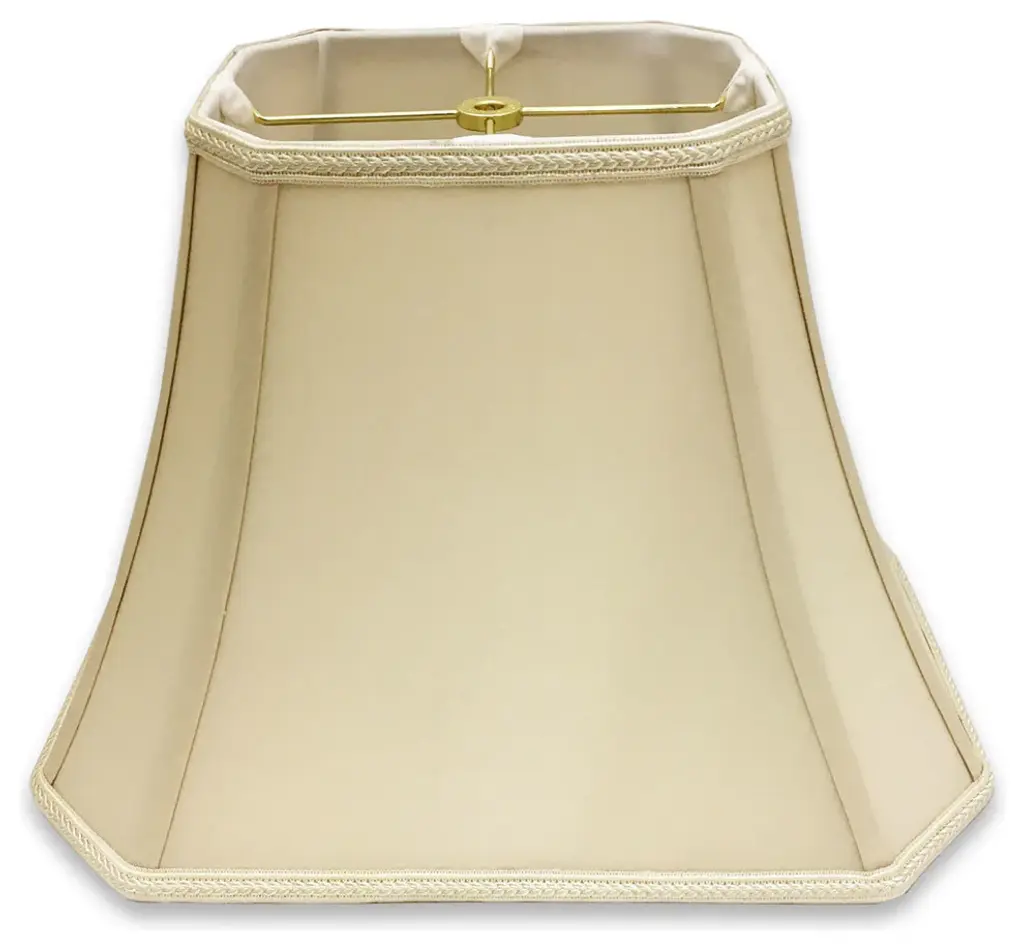 This Rectangle Bell w Cut Corners Designer Lamp shade is a part of Royal Designs, Inc. Timeless Designer Shade Collection and is perfect for anyone who is looking for an elegant yet detailed lampshade. Dimensions: (6.25" x 8") x (11"x 16") x 12"Royal Designs has been in the lampshade business since 1993 with their multiple shade lines that exemplify handcrafted quality and value. -Shape: Rectangle Bell-Fabric: Hand Tailored Silk-Type Shantung Fabric, Premium Off-White Softback Lining-Washer: Standard, 0.5 inch recess, brass-finish spider fitter w/ trademark stamping., Shades with 9""_+ top diameter have a V-Notch fitter for use with a 6""_ or 8""_ reflector bowl, -Frame: High Quality rust resistant metal frame. Thicker than typical standard lamp shades