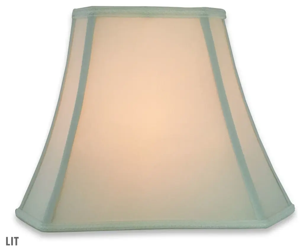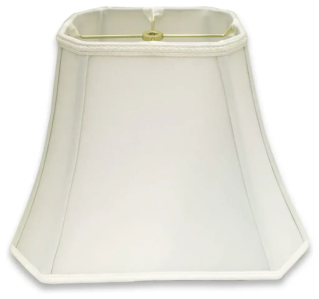 This Rectangle Bell w Cut Corners Designer Lamp shade is a part of Royal Designs, Inc. Timeless Designer Shade Collection and is perfect for anyone who is looking for an elegant yet detailed lampshade. Dimensions: (6.25" x 8") x (11"x 16") x 12"Royal Designs has been in the lampshade business since 1993 with their multiple shade lines that exemplify handcrafted quality and value. -Shape: Rectangle Bell-Fabric: Hand Tailored Silk-Type Shantung Fabric, Premium Off-White Softback Lining-Washer: Standard, 0.5 inch recess, brass-finish spider fitter w/ trademark stamping., Shades with 9""_+ top diameter have a V-Notch fitter for use with a 6""_ or 8""_ reflector bowl, -Frame: High Quality rust resistant metal frame. Thicker than typical standard lamp shades