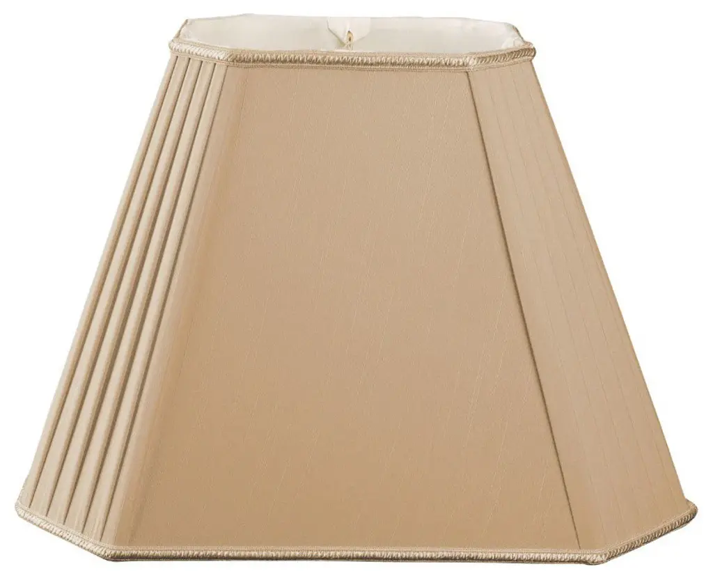 This Rectangle Empire w Pleated Cut Corners Designer Lampshade w Staggered Pleats is a part of Royal Designs, Inc. Timeless Designer Shade Collection and is perfect for anyone who is looking for an elegant yet detailed lampshade. Royal Designs has been in the lampshade business since 1993 with their multiple shade lines that exemplify handcrafted quality and value. Exterior Fabric: Hand Tailored Silk-Type Shantung (except Linen, Mouton, Burlap & Faux Rawhide fabrics) Interior Fabric: Off-White softback lining (Black, Burlap & Faux Rawhide fabrics have gold lining) Washer: Standard brass-finish spider fitter, use a finial to fasten shade. Trim: Top and bottom trim (single or double) with vertical piping Frame: Heavy grade rust resistant metal frame Bulb: Suggested maximum wattage is 150-watt for most sizes (clip on shade max 60W) Height is measured by slant height from top to bottom of the lampshadesfront facePlease measure your existing shade--a replacement harp may be needed for a proper fit or additional adjustment if changing height of shade