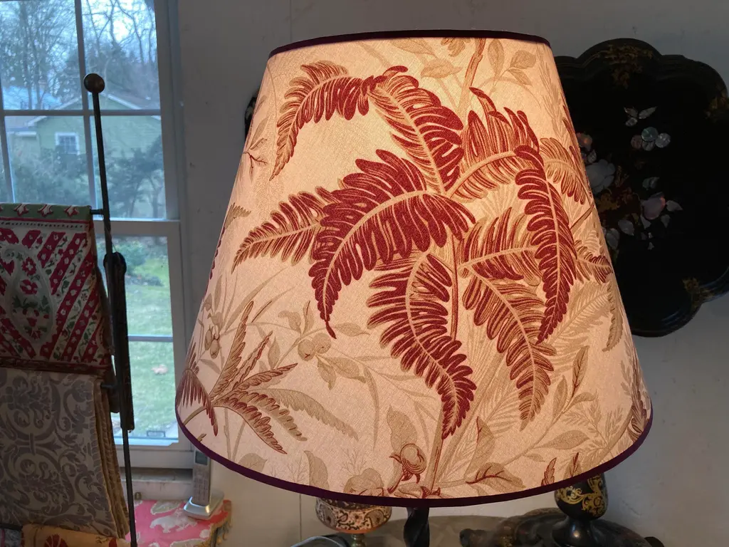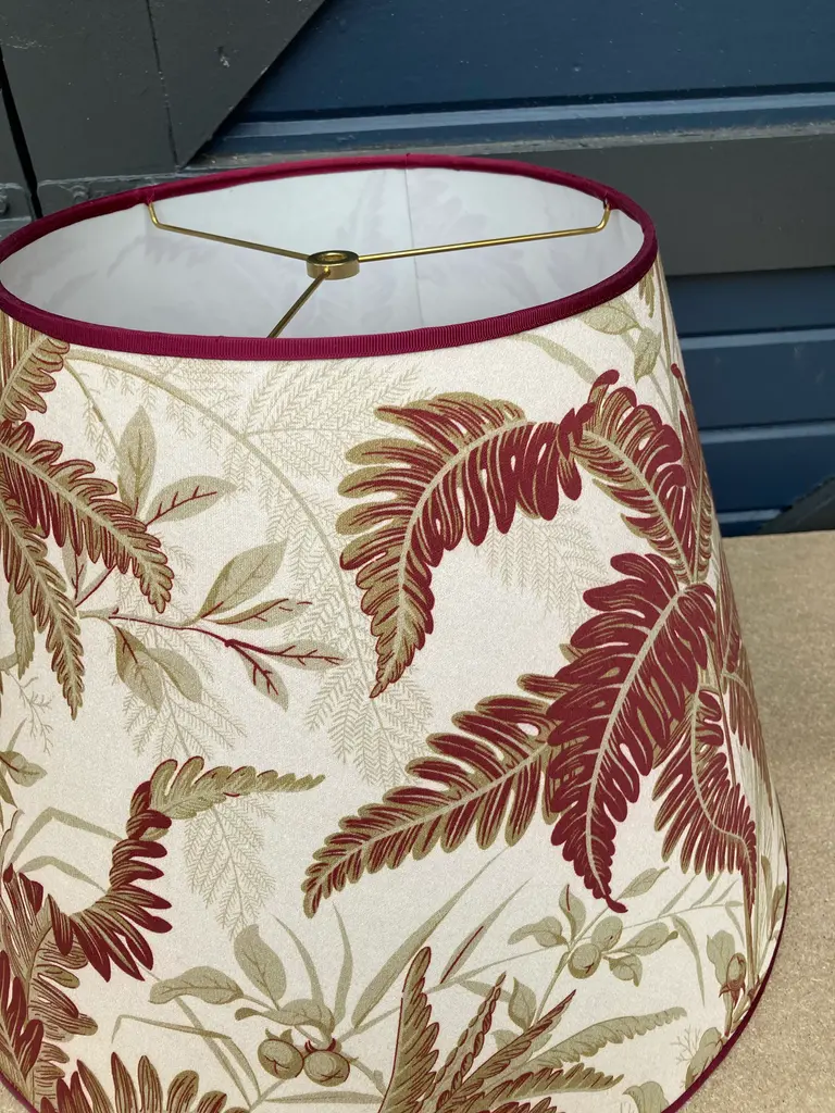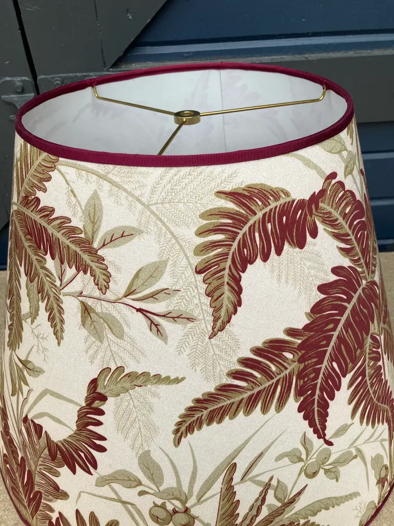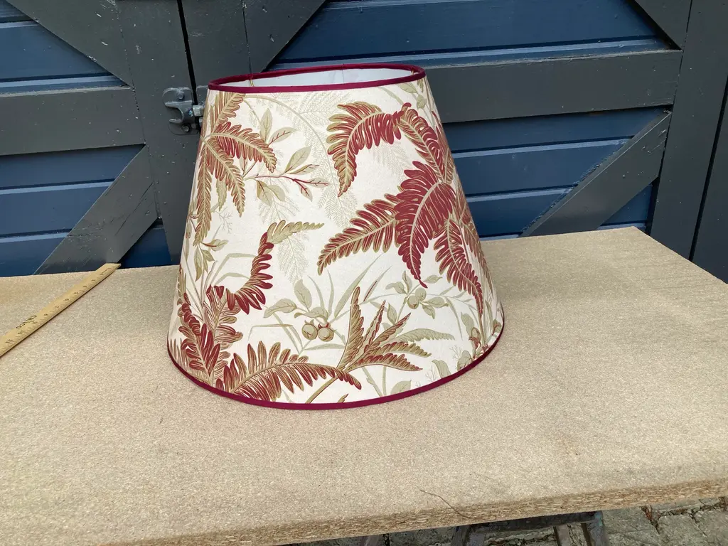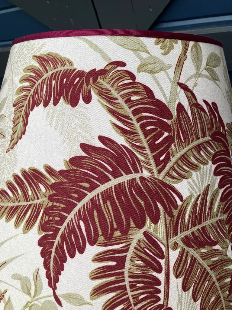 A lampshade handmade from a fern printed cotton. Measurements: top10” bottom 18” side 13”