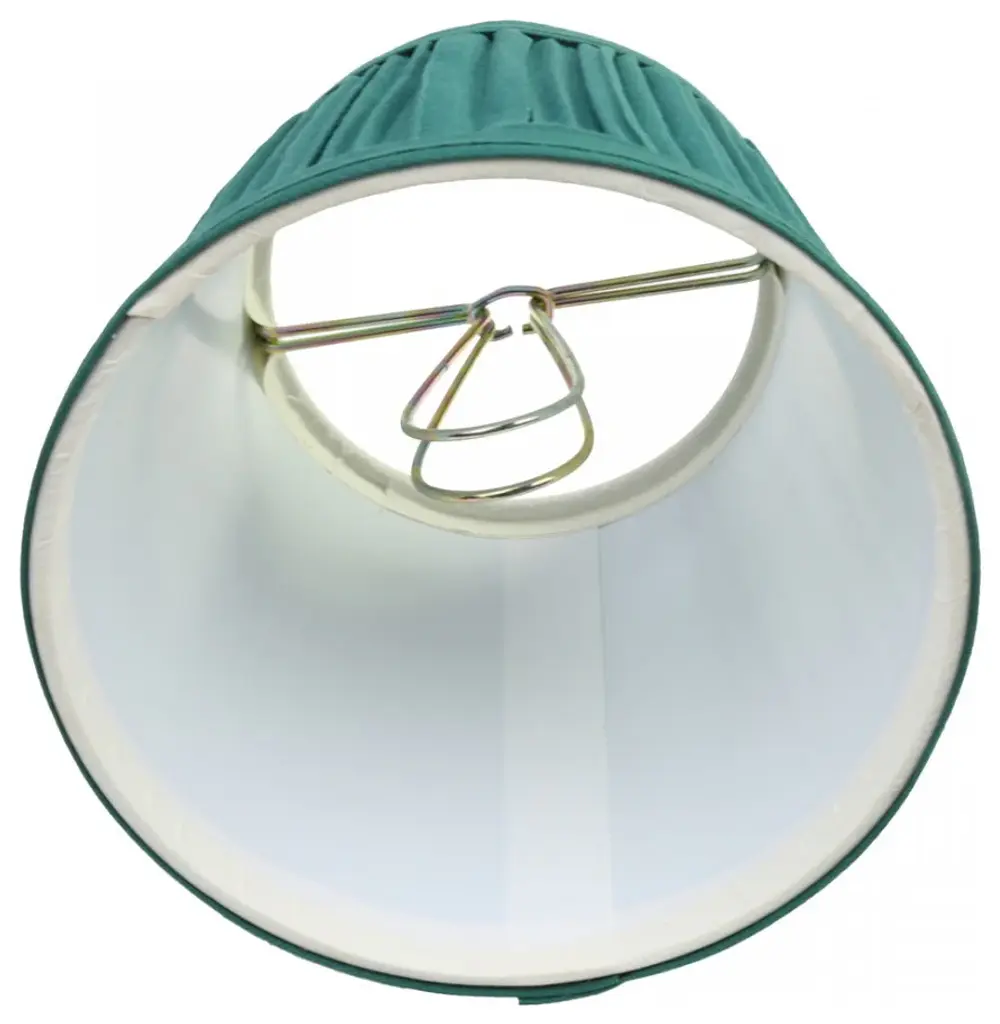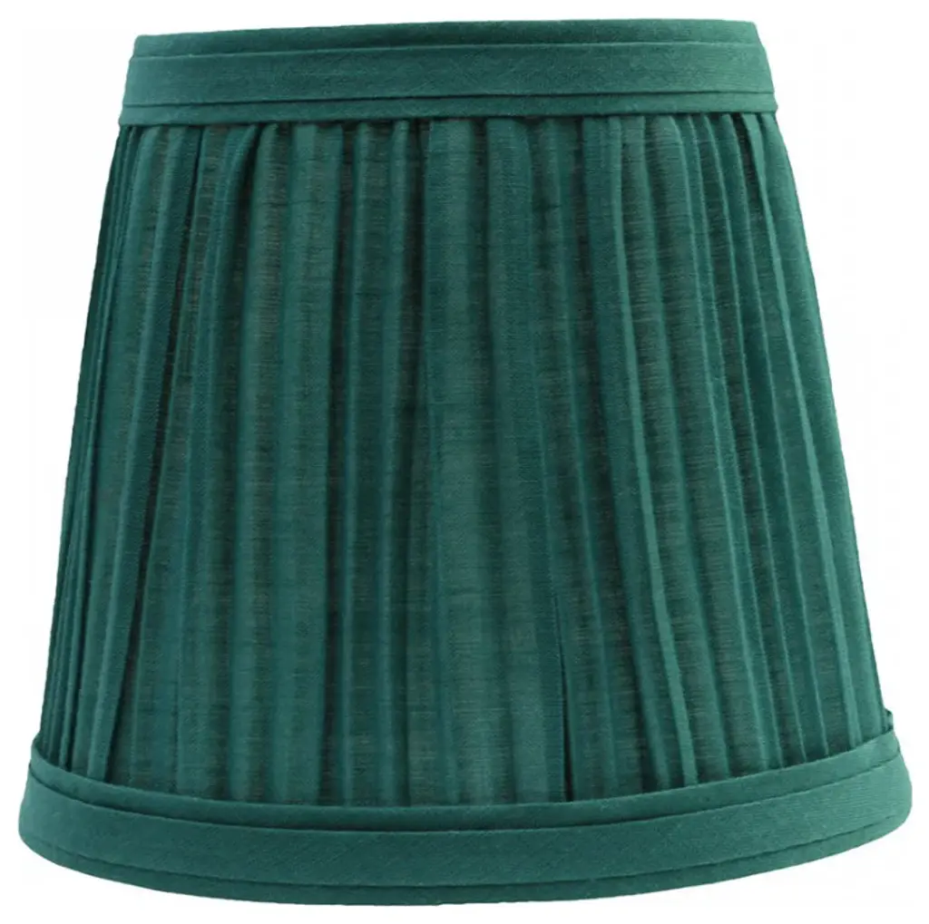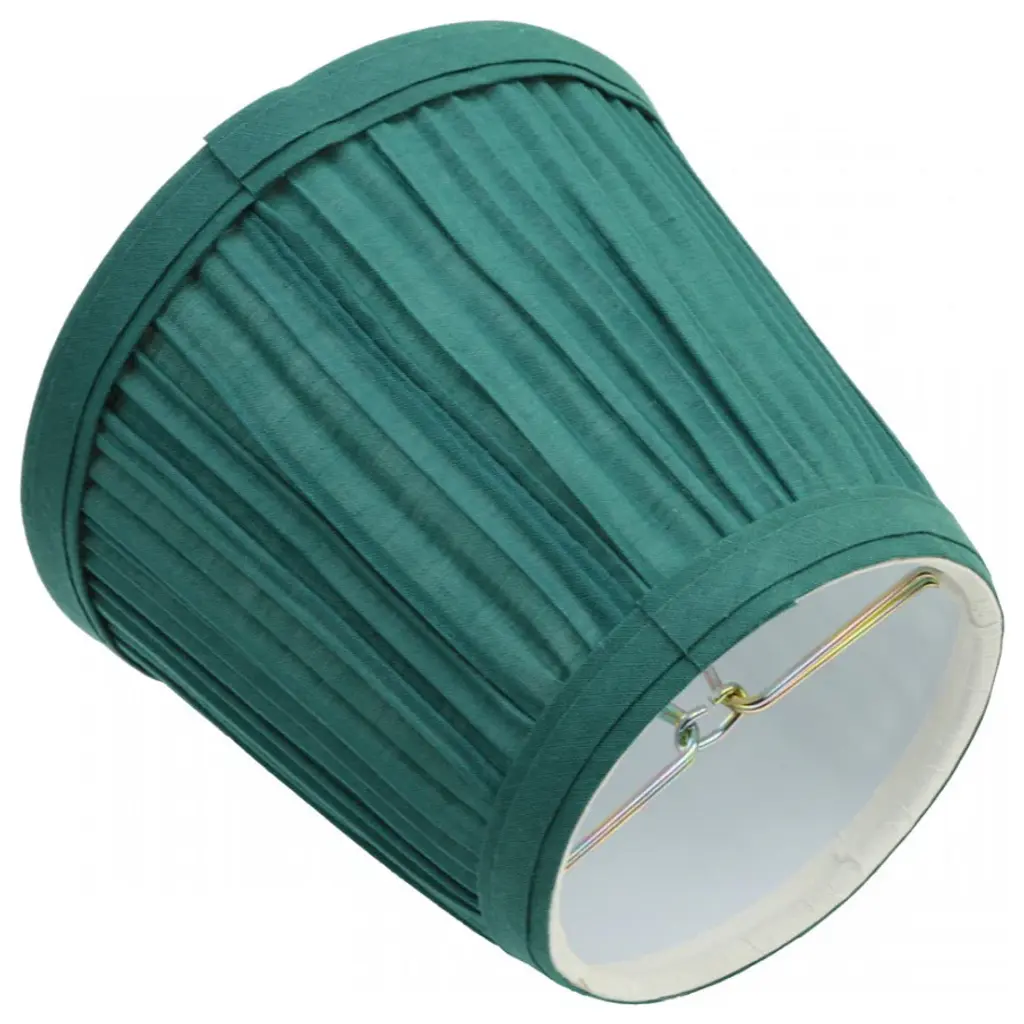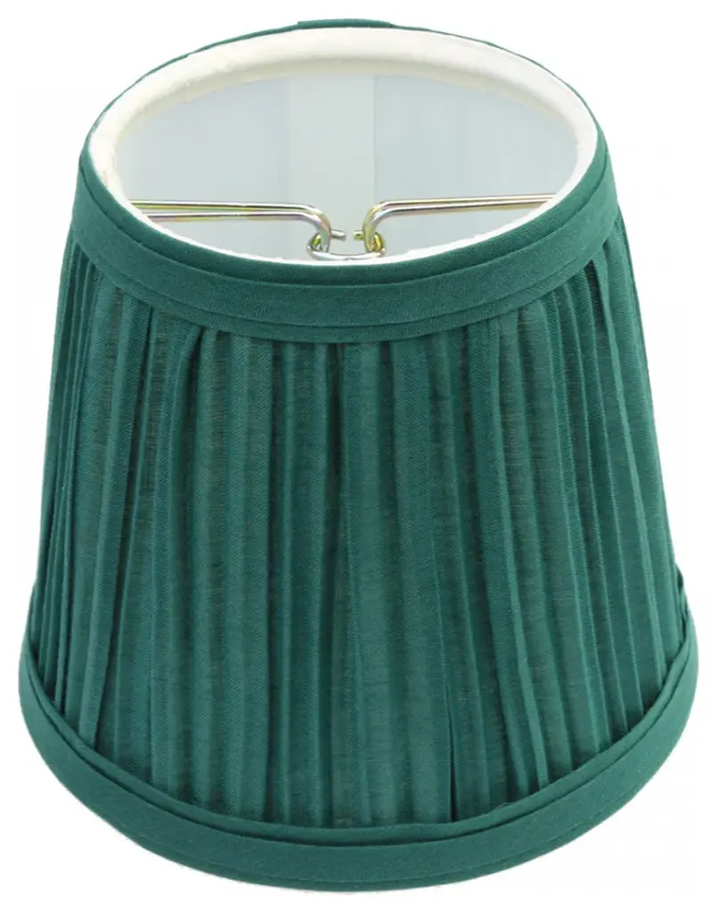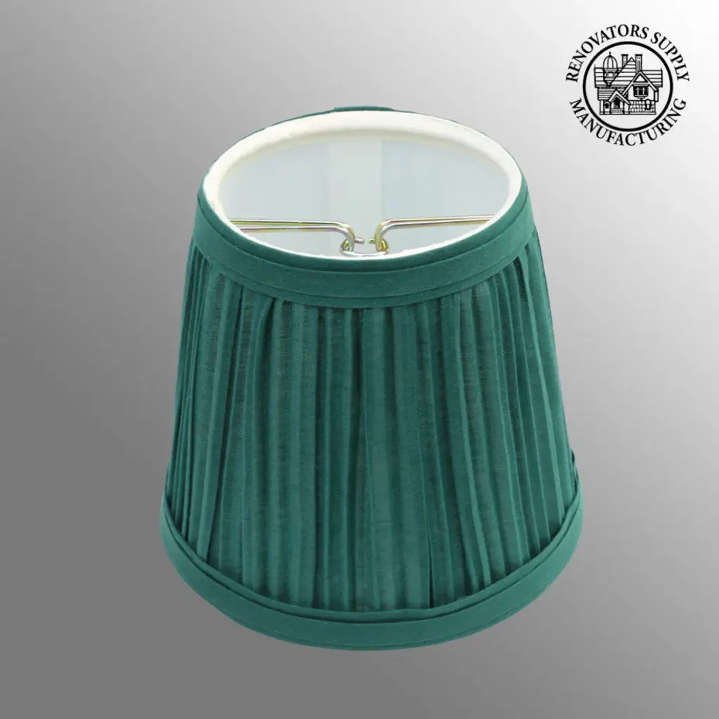 Item 99907 VINTAGE HUNTER GREEN FABRIC PLEATED SMALL CLIP-ON LAMP SHADESOur Hunter Green Mushroom Lamp Shade is handcrafted by industry experts into a beautiful pleated finish. Durable and long lasting natural fabric is selected to construct these masterpieces. The top and bottom band consists of matching fabric. These traditional style Clip On style lamp shades can instantly and inexpensively change the appearance of your lamps.FEATURES- Approximately 4 1/16 in. high x 3 in. top diameter, 4 1/2 in. bottom diameter.- Our Small Clip on Lamp Shades is designed to fit standard candelabra bulbs.- Check our other color lampshades and choose according to your room or your lamp base.- For fit, measure you existing shade or verify whether you need a shade for a candelabra standard or medium or other size bulb before purchase.- Modern clip-on lamp shades feature wire assemblies that slide down over the bulb.SATISFACTION GUARANTEERenovators Supply Manufacturing offers you great value products for your money and a perfect way to spend wisely. We also provide 30 days guarantee with no fee.
