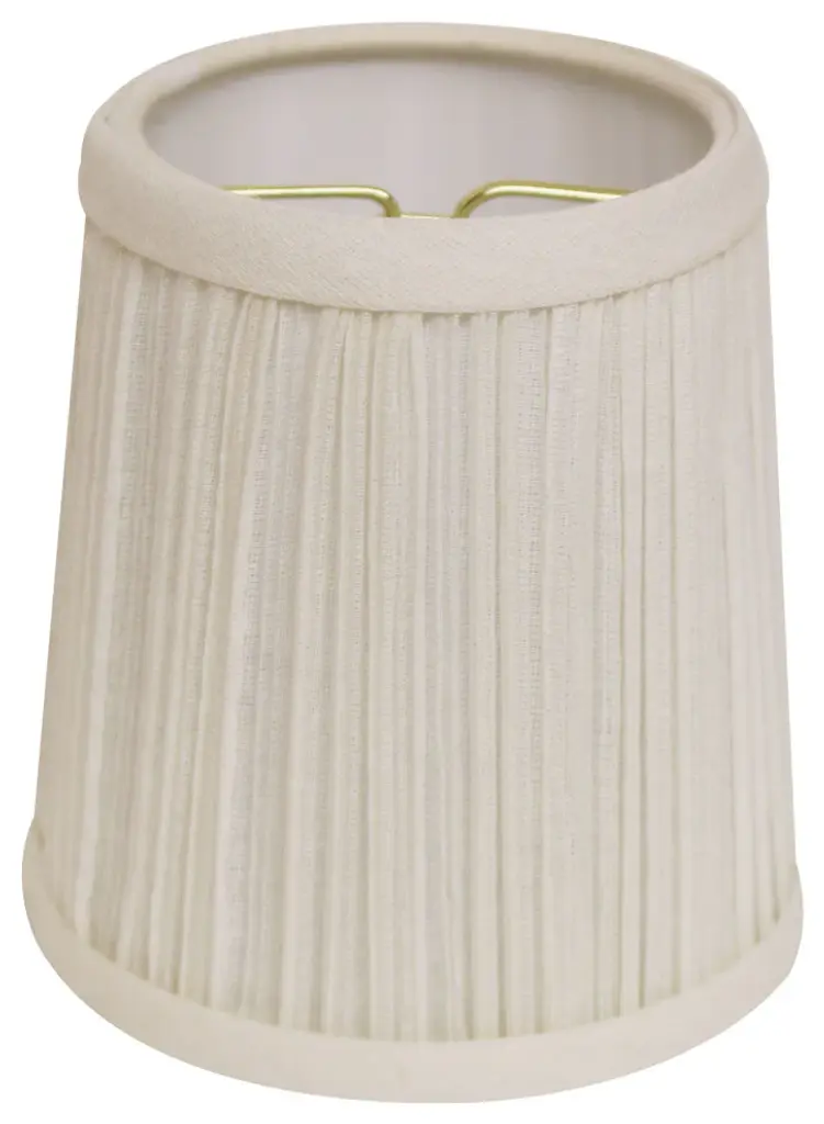 This 5" Twisted Bell Chandelier Lampshade is a part of Royal Designs, Inc. Timeless Chandelier Shade Collection and is perfect for anyone who is looking for a simple yet stunning lampshade. Exterior Fabric: Hand Tailored Silk-Type Shantung Interior Fabric: Off-White lining (Black, Burlap & Faux Rawhide fabrics have gold lining)Clip: Features CLIP-ON fitter designed to fit over a candelabra bulb base (most shades available with double clip-on)Trim: Top and bottom trim (single or double) with vertical pipingFrame: Brass frame that is also rust resistantBulb: Suggested maximum wattage is 60-watt candelabra bulb (we suggest using dimmer switch)Height is measured by vertical height from top to bottom, not slant of the shadeRoyal Designs has been in the lampshade business since 1993 with their multiple shade lines that exemplify handcrafted quality and value.