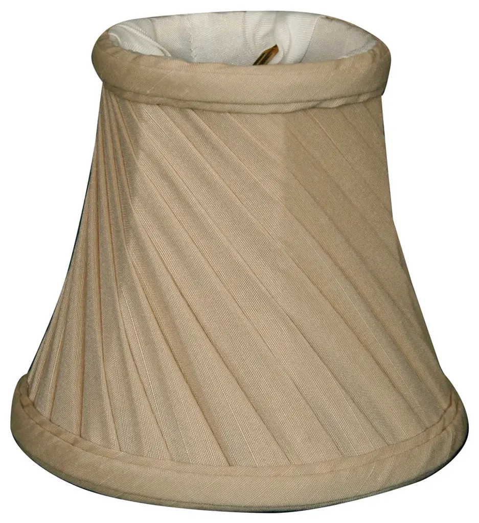 Royal Designs 5" Twisted Bell Chandelier Lampshade is a part of the Timeless Chandelier Shade Collection and is perfect for anyone who is looking for a simple yet stunning lampshade. Exterior Fabric: Hand Tailored Silk-Type Shantung Interior Fabric: Off-White lining (Black, Burlap & Faux Rawhide fabrics have gold lining)Clip: Features CLIP-ON fitter designed to fit over a candelabra bulb base (most shades available with double clip-on)Trim: Top and bottom trim (single or double) with vertical pipingFrame: Brass frame that is also rust resistantBulb: Suggested maximum wattage is 60-watt candelabra bulb (we suggest using dimmer switch)Height is measured by vertical height from top to bottom, not slant of the shadeRoyal Designs has been in the lampshade business since 1993 with their multiple shade lines that exemplify handcrafted quality and value.