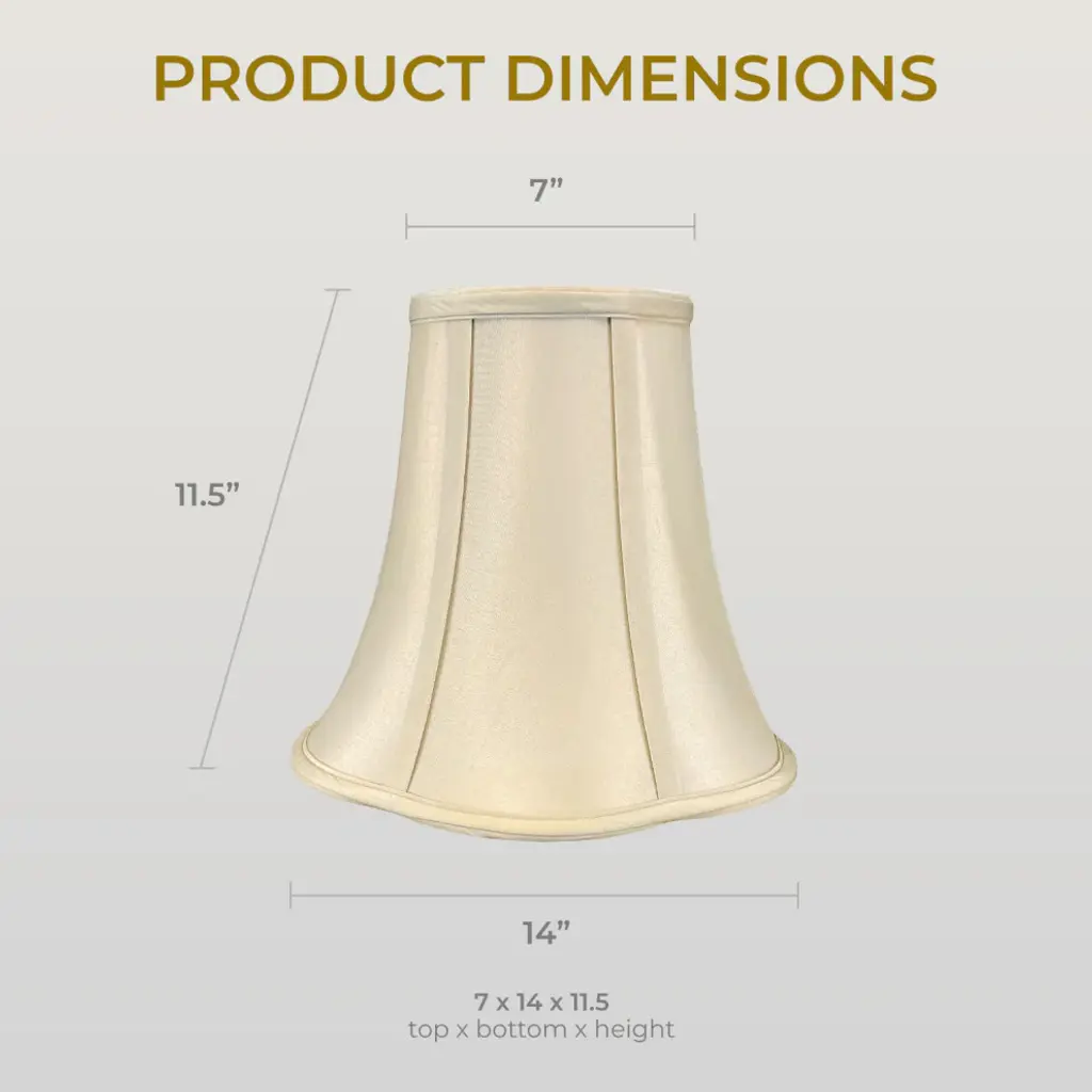 This Flare Bottom Outside Corner bell lampshade is a part of Royal Designs, Inc. Royal Designs has been in the lamp shade business since 1993 with its multiple shade lines that exemplify handcrafted quality and value. Our basic lamp shades collection is perfect for anyone looking for simple yet stunning lamp shades. The lampshades are available in a variety of shapes, sizes, colors, and styles. Our basic shades will blend into your home or office interiors and act as an intriguing decor piece. Take a pick from our Cut-corner or the elegant V-notch style, to add the touch of the appealing atmosphere for either reading, romance, or dining.Specification:Brand: Royal Designs, Inc.Type: Scallop Bell Lamp ShadeMaterial: FabricShape: Scallop BellColor: Antique Gold/ Beige/ Black/ Eggshell/ WhiteSize: 5 x 10 x 8.25 inch/ 6 x 12 x 10.25 inch/ 5 x 13 x 8.75 inch/ 7 x 14 x 11.5 inch/ 8 x 16 x 13 inch/ 9 x 18 x 16 inch/ 10 x 20 x 15.5 inchBulb Type: IncandescentMax Bulb Wattage: 100 watts