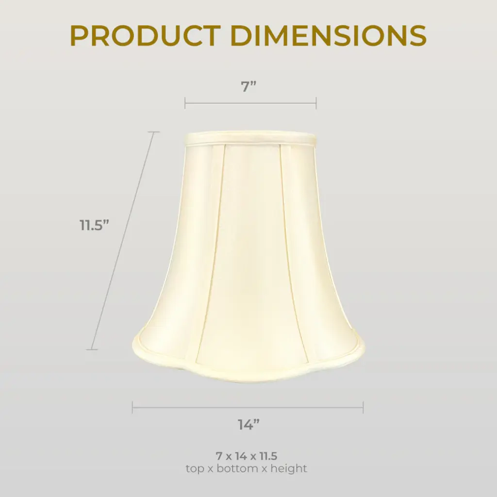 This Flare Bottom Outside Corner bell lampshade is a part of Royal Designs, Inc. Royal Designs has been in the lamp shade business since 1993 with its multiple shade lines that exemplify handcrafted quality and value. Our basic lamp shades collection is perfect for anyone looking for simple yet stunning lamp shades. The lampshades are available in a variety of shapes, sizes, colors, and styles. Our basic shades will blend into your home or office interiors and act as an intriguing decor piece. Take a pick from our Cut-corner or the elegant V-notch style, to add the touch of the appealing atmosphere for either reading, romance, or dining.Specification:Brand: Royal Designs, Inc.Type: Scallop Bell Lamp ShadeMaterial: FabricShape: Scallop BellColor: Antique Gold/ Beige/ Black/ Eggshell/ WhiteSize: 5 x 10 x 8.25 inch/ 6 x 12 x 10.25 inch/ 5 x 13 x 8.75 inch/ 7 x 14 x 11.5 inch/ 8 x 16 x 13 inch/ 9 x 18 x 16 inch/ 10 x 20 x 15.5 inchBulb Type: IncandescentMax Bulb Wattage: 100 watts