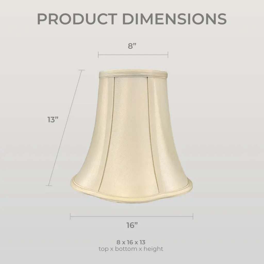 This lampshade mimics the shape of a petunia flower and is just as beautiful. The soft scalloped edge at the bottom creates contrast and interest with your lamp base. Made of tailored silk-type shantung fabric with an off-white softback lining (black shades have gold softback lining) to create a warm, soft glow. The Bottom Scalloped Bell Lamp Shade is part of the Royal Designs, Inc. Timeless™ Basic Shade Collection. Royal Designs has been in the lampshade business since 1993 with our multiple shade lines that exemplify handcrafted quality and value. Height is measured by slant height from top to bottom of the lampshades"™ front face. Measurements listed as (Top Diameter x Bottom Diameter x Slant Height). Please measure your existing shade--a replacement harp may be needed for a proper fit or additional adjustment if changing the height of the shade.DIMENSION: Our traditional basic scalloped bell lamp shade measures 5" x 10" x 8.25" (Top Diameter x Bottom Diameter x Slant Height)DIMENSION: Our traditional basic scalloped bell lamp shade measures 6" x 12" x 10.25" (Top Diameter x Bottom Diameter x Slant Height)DIMENSION: Our traditional basic scalloped bell lamp shade measures 7" x 14" x 11.5" (Top Diameter x Bottom Diameter x Slant Height)DIMENSION: Our traditional basic scalloped bell lamp shade measures 8" x 16" x 13" (Top Diameter x Bottom Diameter x Slant Height)MATERIALS: Our classic lampshade is made from premium silk-type shantung fabric and sturdy off-white styrene lining.EASY TO USE: The standard spider fitter works with most lamps and is held in place by any final or cap.TRADITIONAL DESIGN: Works perfectly with floor lamps or tall table lamps with a small to medium base. Our shade will also fit in beautifully in transitional and modern home decors.APPLICATION: Use our lamp shade for table lamps, accent lamps, vintage lamps, and even candlestick lamps! The timeless design is great for any room.