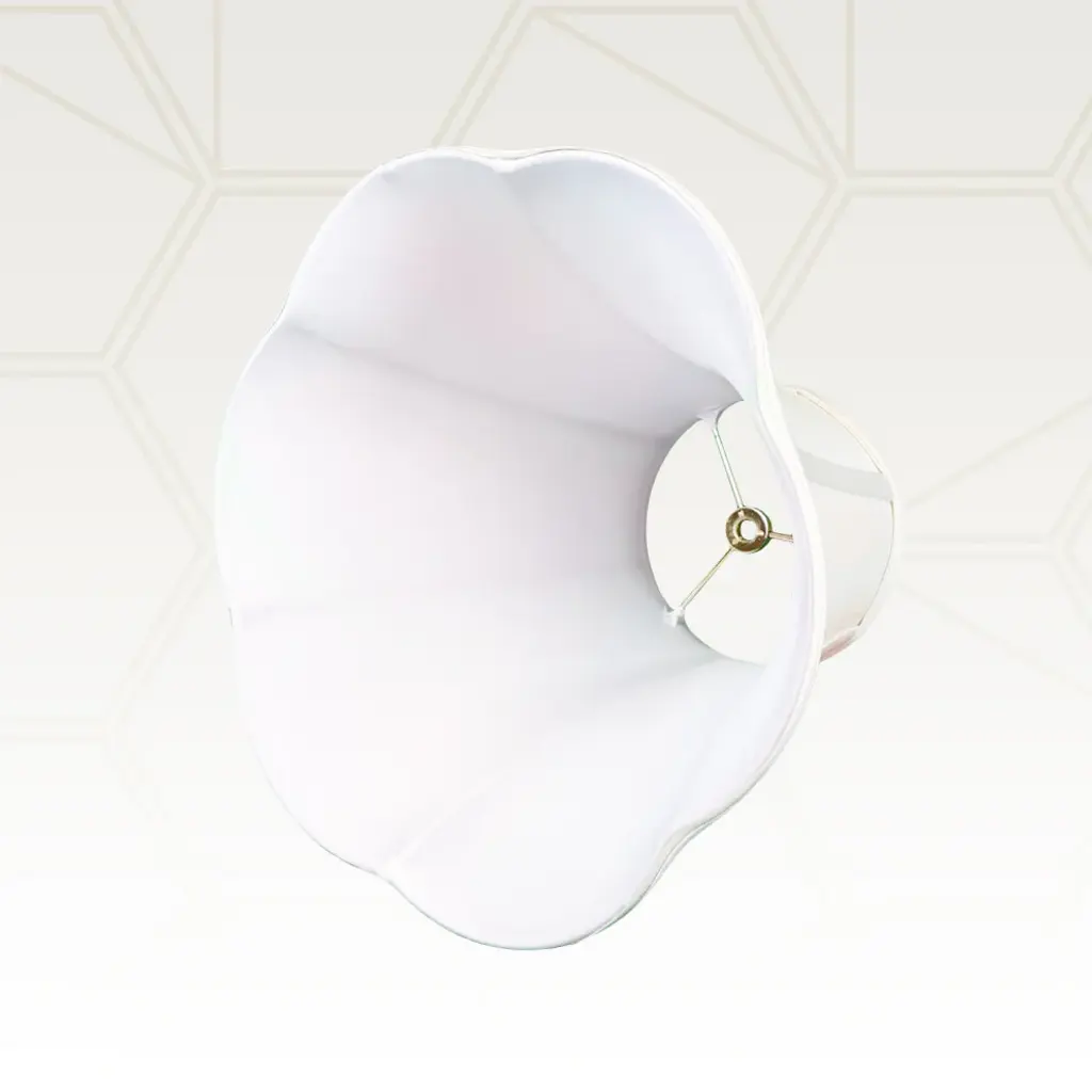 This lampshade mimics the shape of a petunia flower and is just as beautiful. The soft scalloped edge at the bottom creates contrast and interest with your lamp base. Made of tailored silk-type shantung fabric with an off-white softback lining (black shades have gold softback lining) to create a warm, soft glow. The Bottom Scalloped Bell Lamp Shade is part of the Royal Designs, Inc. Timeless™ Basic Shade Collection. Royal Designs has been in the lampshade business since 1993 with our multiple shade lines that exemplify handcrafted quality and value. Height is measured by slant height from top to bottom of the lampshades"™ front face. Measurements listed as (Top Diameter x Bottom Diameter x Slant Height). Please measure your existing shade--a replacement harp may be needed for a proper fit or additional adjustment if changing the height of the shade.DIMENSION: Our traditional basic scalloped bell lamp shade measures 5" x 10" x 8.25" (Top Diameter x Bottom Diameter x Slant Height)DIMENSION: Our traditional basic scalloped bell lamp shade measures 6" x 12" x 10.25" (Top Diameter x Bottom Diameter x Slant Height)DIMENSION: Our traditional basic scalloped bell lamp shade measures 7" x 14" x 11.5" (Top Diameter x Bottom Diameter x Slant Height)DIMENSION: Our traditional basic scalloped bell lamp shade measures 8" x 16" x 13" (Top Diameter x Bottom Diameter x Slant Height)MATERIALS: Our classic lampshade is made from premium silk-type shantung fabric and sturdy off-white styrene lining.EASY TO USE: The standard spider fitter works with most lamps and is held in place by any final or cap.TRADITIONAL DESIGN: Works perfectly with floor lamps or tall table lamps with a small to medium base. Our shade will also fit in beautifully in transitional and modern home decors.APPLICATION: Use our lamp shade for table lamps, accent lamps, vintage lamps, and even candlestick lamps! The timeless design is great for any room.