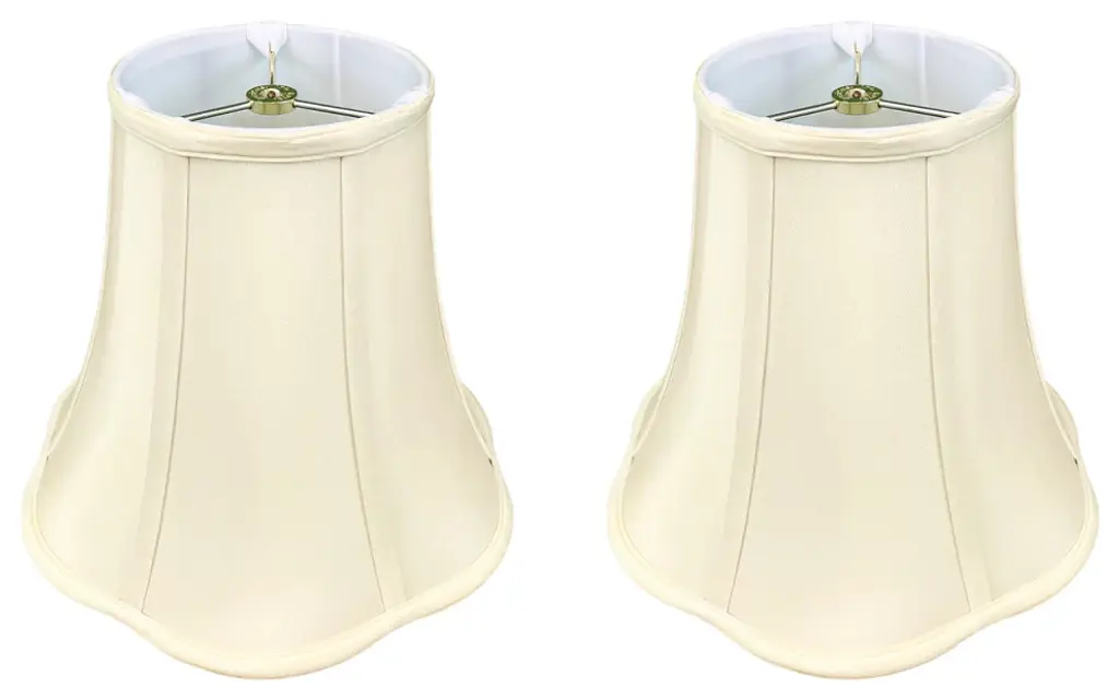 This lampshade mimics the shape of a petunia flower and is just as beautiful. The soft scalloped edge at the bottom creates contrast and interest with your lamp base. Made of tailored silk-type shantung fabric with an off-white softback lining (black shades have gold softback lining) to create a warm, soft glow. The Bottom Scalloped Bell Lamp Shade is part of the Royal Designs, Inc. Timeless™ Basic Shade Collection. Royal Designs has been in the lampshade business since 1993 with our multiple shade lines that exemplify handcrafted quality and value. Height is measured by slant height from top to bottom of the lampshades"™ front face. Measurements listed as (Top Diameter x Bottom Diameter x Slant Height). Please measure your existing shade--a replacement harp may be needed for a proper fit or additional adjustment if changing the height of the shade.DIMENSION: Our traditional basic scalloped bell lamp shade measures 5" x 10" x 8.25" (Top Diameter x Bottom Diameter x Slant Height)DIMENSION: Our traditional basic scalloped bell lamp shade measures 6" x 12" x 10.25" (Top Diameter x Bottom Diameter x Slant Height)DIMENSION: Our traditional basic scalloped bell lamp shade measures 7" x 14" x 11.5" (Top Diameter x Bottom Diameter x Slant Height)DIMENSION: Our traditional basic scalloped bell lamp shade measures 8" x 16" x 13" (Top Diameter x Bottom Diameter x Slant Height)MATERIALS: Our classic lampshade is made from premium silk-type shantung fabric and sturdy off-white styrene lining.EASY TO USE: The standard spider fitter works with most lamps and is held in place by any final or cap.TRADITIONAL DESIGN: Works perfectly with floor lamps or tall table lamps with a small to medium base. Our shade will also fit in beautifully in transitional and modern home decors.APPLICATION: Use our lamp shade for table lamps, accent lamps, vintage lamps, and even candlestick lamps! The timeless design is great for any room.