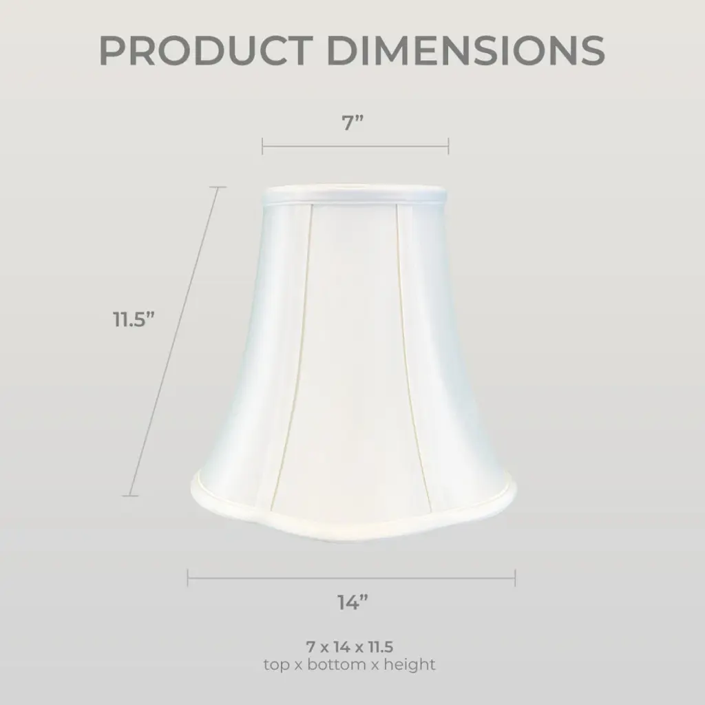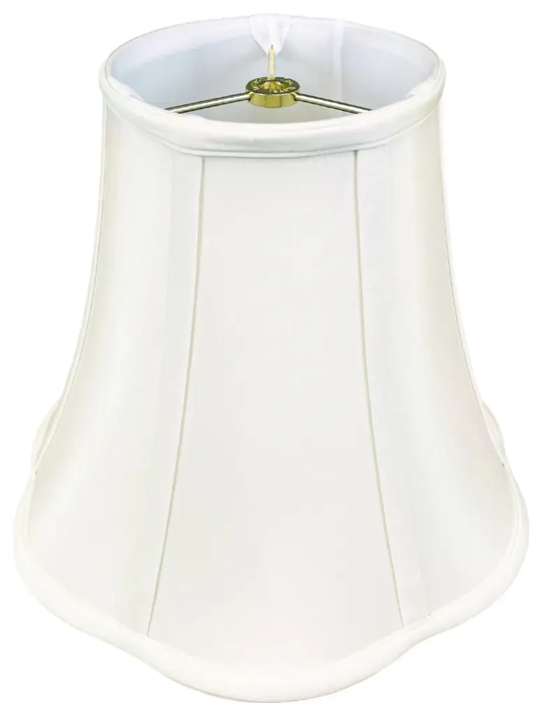 This lampshade mimics the shape of a petunia flower and is just as beautiful. The soft scalloped edge at the bottom creates contrast and interest with your lamp base. Made of tailored silk-type shantung fabric with an off-white softback lining (black shades have gold softback lining) to create a warm, soft glow. The Bottom Scalloped Bell Lamp Shade is part of the Royal Designs, Inc. Timeless™ Basic Shade Collection. Royal Designs has been in the lampshade business since 1993 with our multiple shade lines that exemplify handcrafted quality and value. Height is measured by slant height from top to bottom of the lampshades"™ front face. Measurements listed as (Top Diameter x Bottom Diameter x Slant Height). Please measure your existing shade--a replacement harp may be needed for a proper fit or additional adjustment if changing the height of the shade.DIMENSION: Our traditional basic scalloped bell lamp shade measures 5" x 10" x 8.25" (Top Diameter x Bottom Diameter x Slant Height)DIMENSION: Our traditional basic scalloped bell lamp shade measures 6" x 12" x 10.25" (Top Diameter x Bottom Diameter x Slant Height)DIMENSION: Our traditional basic scalloped bell lamp shade measures 7" x 14" x 11.5" (Top Diameter x Bottom Diameter x Slant Height)DIMENSION: Our traditional basic scalloped bell lamp shade measures 8" x 16" x 13" (Top Diameter x Bottom Diameter x Slant Height)MATERIALS: Our classic lampshade is made from premium silk-type shantung fabric and sturdy off-white styrene lining.EASY TO USE: The standard spider fitter works with most lamps and is held in place by any final or cap.TRADITIONAL DESIGN: Works perfectly with floor lamps or tall table lamps with a small to medium base. Our shade will also fit in beautifully in transitional and modern home decors.APPLICATION: Use our lamp shade for table lamps, accent lamps, vintage lamps, and even candlestick lamps! The timeless design is great for any room.