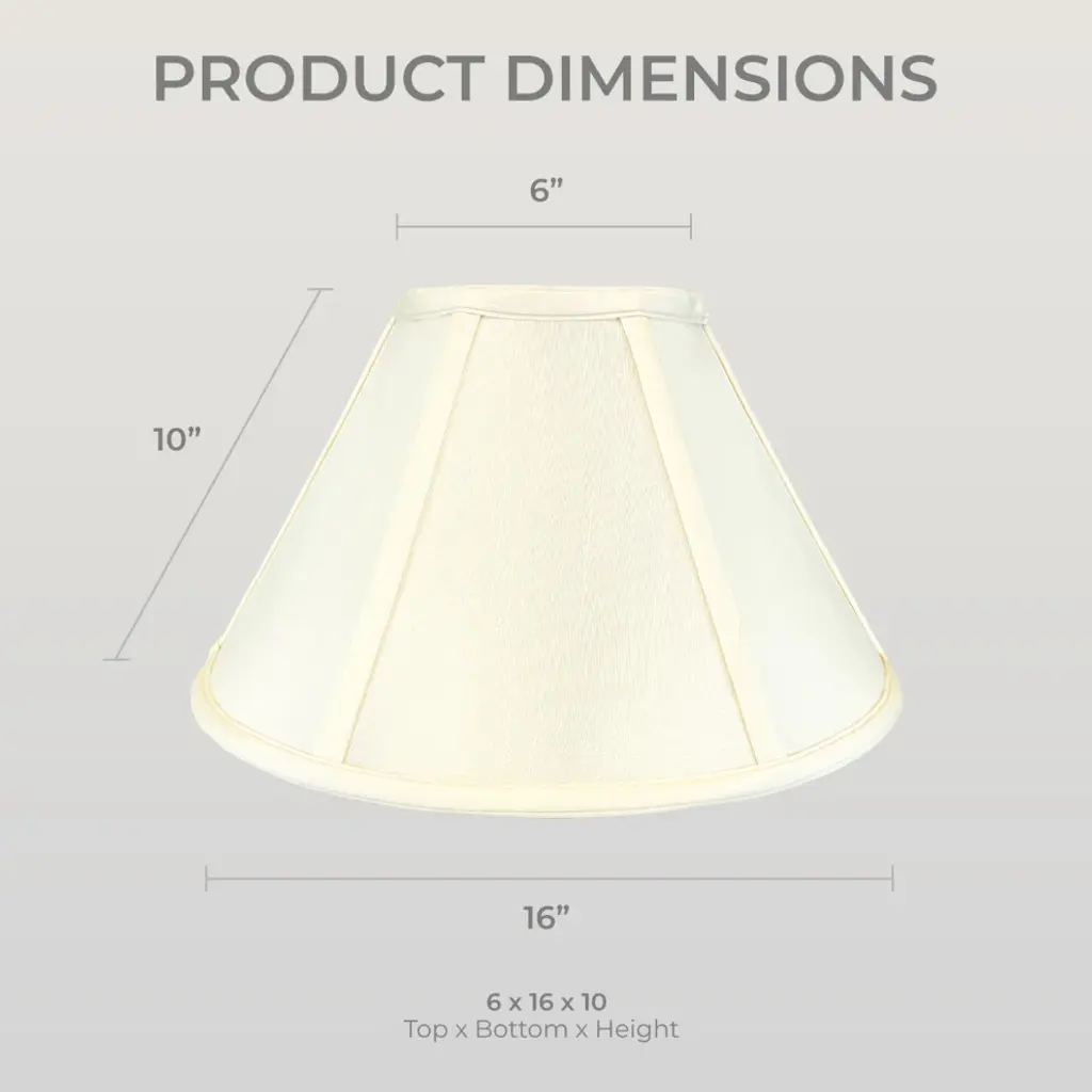 The Coolie Empire Basic Lamp Shade is part of the Royal Designs, Inc. Timeless Basic Shade Collection and is a traditional yet stunning way to finish the look of your lamp. Our fancy lampshade makes a subtle statement and will turn your floor lamp or table lamp into a talking piece. We have decades of experience in the business of lampshades and we''re proud to offer multiple product lines that exemplify handcrafted quality and value. Be sure to browse our vast collection of shades in a wide variety of distinctive shapes that will add a new level of sophistication to your lighting and home decor.Height is measured on the slant from the top to the bottom of the lamp shade''s front face.DIMENSION: Our traditional basic coolie lamp shade measures 5" x 13" x 8" (Top Diameter x Bottom Diameter x Slant Height)DIMENSION: Our traditional basic coolie lamp shade measures 5" x 14" x 9.5" (Top Diameter x Bottom Diameter x Slant Height)DIMENSION: Our traditional basic coolie lamp shade measures 6" x 16" x 10" (Top Diameter x Bottom Diameter x Slant Height)DIMENSION: Our traditional basic coolie lamp shade measures 6" x 18" x 11.5" (Top Diameter x Bottom Diameter x Slant Height)DIMENSION: Our traditional basic coolie lamp shade measures 7" x 20" x 12.5" (Top Diameter x Bottom Diameter x Slant Height)MATERIALS: Our classic lampshade is made from premium silk-type shantung fabric and sturdy off-white styrene lining.EASY TO USE: The standard spider fitter works with most lamps and is held in place by any final or cap.TRADITIONAL DESIGN: Works perfectly with floor lamps or tall table lamps with a small to medium base. Our shade will also fit in beautifully in transitional and modern home decors.APPLICATION: Use our lamp shade for table lamps, accent lamps, vintage lamps, and even candlestick lamps! The timeless design is great for any room.Specification:Brand: Royal Designs, Inc.Type: Empire Lamp ShadeMaterial: FabricShape: Empire