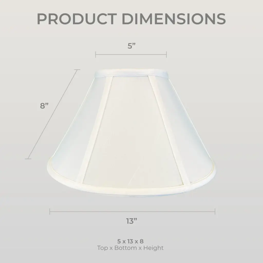 The Coolie Empire Basic Lamp Shade is part of the Royal Designs, Inc. Timeless Basic Shade Collection and is a traditional yet stunning way to finish the look of your lamp. Our fancy lampshade makes a subtle statement and will turn your floor lamp or table lamp into a talking piece. We have decades of experience in the business of lampshades and we''re proud to offer multiple product lines that exemplify handcrafted quality and value. Be sure to browse our vast collection of shades in a wide variety of distinctive shapes that will add a new level of sophistication to your lighting and home decor.Height is measured on the slant from the top to the bottom of the lamp shade''s front face.DIMENSION: Our traditional basic coolie lamp shade measures 5" x 13" x 8" (Top Diameter x Bottom Diameter x Slant Height)DIMENSION: Our traditional basic coolie lamp shade measures 5" x 14" x 9.5" (Top Diameter x Bottom Diameter x Slant Height)DIMENSION: Our traditional basic coolie lamp shade measures 6" x 16" x 10" (Top Diameter x Bottom Diameter x Slant Height)DIMENSION: Our traditional basic coolie lamp shade measures 6" x 18" x 11.5" (Top Diameter x Bottom Diameter x Slant Height)DIMENSION: Our traditional basic coolie lamp shade measures 7" x 20" x 12.5" (Top Diameter x Bottom Diameter x Slant Height)MATERIALS: Our classic lampshade is made from premium silk-type shantung fabric and sturdy off-white styrene lining.EASY TO USE: The standard spider fitter works with most lamps and is held in place by any final or cap.TRADITIONAL DESIGN: Works perfectly with floor lamps or tall table lamps with a small to medium base. Our shade will also fit in beautifully in transitional and modern home decors.APPLICATION: Use our lamp shade for table lamps, accent lamps, vintage lamps, and even candlestick lamps! The timeless design is great for any room.Specification:Brand: Royal Designs, Inc.Type: Empire Lamp ShadeMaterial: FabricShape: Empire
