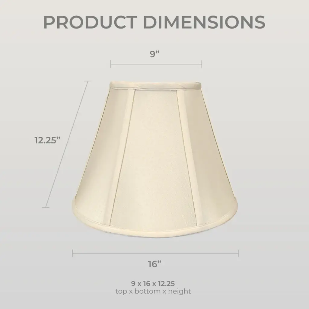 The Deep Empire Basic Lamp Shade is part of the Royal Designs, Inc. Timeless Basic Shade Collection and is a traditional yet stunning way to finish the look of your lamp. Our fancy lampshade makes a subtle statement and will turn your floor lamp or table lamp into a talking piece. We have decades of experience in the business of lampshades and we''re proud to offer multiple product lines that exemplify handcrafted quality and value. Be sure to browse our vast collection of shades in a wide variety of distinctive shapes that will add a new level of sophistication to your lighting and home decor.Height is measured on the slant from the top to the bottom of the lamp shade''s front face.DIMENSION: Our traditional basic empire lamp shade measures 6" x 12" x 9.25" (Top Diameter x Bottom Diameter x Slant Height)DIMENSION: Our traditional basic empire lamp shade measures 8" x 14" x 11" (Top Diameter x Bottom Diameter x Slant Height)DIMENSION: Our traditional basic empire lamp shade measures 9" x 16" x 12.25" (Top Diameter x Bottom Diameter x Slant Height)DIMENSION: Our traditional basic empire lamp shade measures 9" x 18" x 14" (Top Diameter x Bottom Diameter x Slant Height)MATERIALS: Our classic lampshade is made from premium silk-type shantung fabric and sturdy off-white styrene lining.EASY TO USE: The standard spider fitter works with most lamps and is held in place by any final or cap.TRADITIONAL DESIGN: Works perfectly with floor lamps or tall table lamps with a small to medium base. Our shade will also fit in beautifully in transitional and modern home decors.APPLICATION: Use our lamp shade for table lamps, accent lamps, vintage lamps, and even candlestick lamps! The timeless design is great for any room.Specification:Brand: Royal Designs, Inc.Type: Empire Lamp ShadeMaterial: FabricShape: Empire
