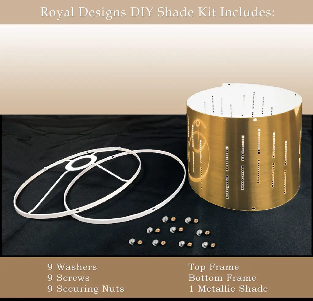 Royal Designs has been in the lampshade business since 1993 with its multiple shade lines that exemplify handcrafted quality and value. This Hardback lampshade is a part of Royal Designs, Inc. All hardback shade collections are perfect for indoor and outdoor. We have used silk-type shantung interior fabric with off-white hardback lining, also have used 0.5-inch washer, standard brass-finish spider lamp shade Fitter.Specification:Brand: Royal Designs, Inc.Type: DIY Hardback LampshadeMaterial: Polystyrene fabricShape: Shallow DrumColor: Polished Nickel / Polished Gold / Polished CopperSize: 8 x 8 x 8 inch / 10 x 10 x 8.5 inch / 12 x 12 x 9 inch / 14 x 14 x 10 inch / 16 x 16 x 10.5 inchMaximum Wattage: 100WDIMENSION: Our hardback lamp shade measures height 8 inches, top 8 inches, bottom 8 inches. Shades with 9"+ top diameter have a v-notch fitter for use with a 6" or 8" reflector bowl.DIMENSION: Our hardback lamp shade measures height 8.5 inches, top 10 inches, bottom 10 inches. Shades with 9"+ top diameter have a v-notch fitter for use with a 6" or 8" reflector bowl.DIMENSION: Our hardback lamp shade measures height 9 inches, top 12 inches, bottom 12 inches. Shades with 9"+ top diameter have a v-notch fitter for use with a 6" or 8" reflector bowl.DIMENSION: Our hardback lamp shade measures height 10 inches, top 14 inches, bottom 14 inches. Shades with 9"+ top diameter have a v-notch fitter for use with a 6" or 8" reflector bowl.DIMENSION: Our hardback lamp shade measures height 10.5 inches, top 16 inches, bottom 16 inches. Shades with 9"+ top diameter have a v-notch fitter for use with a 6" or 8" reflector bowl.MATERIAL: Made from polystyrene fabric and with a white interior and heavy grade rust-resistant 1.5mm metal frame that is thicker than the typical standard lamp shade. DIY LAMPSHADE KIT: Make a lampshade for any interior space with this DIY lampshade kit. It comes with top and bottom flat wireframes and assembly parts.CLEAN DESIGN: Our clean design Do It Yourself simple lampshade easily suits any interior space and decorative themes. The shade has a standard lampshade washer with a brass finish and a spider fitter or UNO fitter.APPLICATION: Quick and easy assembly knock-down style lampshade is suitable for table lamps, accent lamps, vintage lamps, candle stick lamps, and kid''s room lamps.