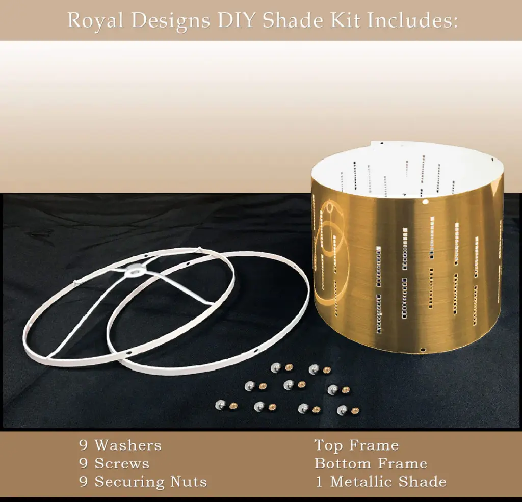 Royal Designs has been in the lampshade business since 1993 with its multiple shade lines that exemplify handcrafted quality and value. This Hardback lampshade is a part of Royal Designs, Inc. All hardback shade collections are perfect for indoor and outdoor. We have used silk-type shantung interior fabric with off-white hardback lining, also have used 0.5-inch washer, standard brass-finish spider lamp shade Fitter.Specification:Brand: Royal Designs, Inc.Type: DIY Hardback LampshadeMaterial: Polystyrene fabricShape: Shallow DrumColor: Polished Nickel / Polished Gold / Polished CopperSize: 8 x 8 x 8 inch / 10 x 10 x 8.5 inch / 12 x 12 x 9 inch / 14 x 14 x 10 inch / 16 x 16 x 10.5 inchMaximum Wattage: 100WDIMENSION: Our hardback lamp shade measures height 8 inches, top 8 inches, bottom 8 inches. Shades with 9"+ top diameter have a v-notch fitter for use with a 6" or 8" reflector bowl.DIMENSION: Our hardback lamp shade measures height 8.5 inches, top 10 inches, bottom 10 inches. Shades with 9"+ top diameter have a v-notch fitter for use with a 6" or 8" reflector bowl.DIMENSION: Our hardback lamp shade measures height 9 inches, top 12 inches, bottom 12 inches. Shades with 9"+ top diameter have a v-notch fitter for use with a 6" or 8" reflector bowl.DIMENSION: Our hardback lamp shade measures height 10 inches, top 14 inches, bottom 14 inches. Shades with 9"+ top diameter have a v-notch fitter for use with a 6" or 8" reflector bowl.DIMENSION: Our hardback lamp shade measures height 10.5 inches, top 16 inches, bottom 16 inches. Shades with 9"+ top diameter have a v-notch fitter for use with a 6" or 8" reflector bowl.MATERIAL: Made from polystyrene fabric and with a white interior and heavy grade rust-resistant 1.5mm metal frame that is thicker than the typical standard lamp shade. DIY LAMPSHADE KIT: Make a lampshade for any interior space with this DIY lampshade kit. It comes with top and bottom flat wireframes and assembly parts.CLEAN DESIGN: Our clean design Do It Yourself simple lampshade easily suits any interior space and decorative themes. The shade has a standard lampshade washer with a brass finish and a spider fitter or UNO fitter.APPLICATION: Quick and easy assembly knock-down style lampshade is suitable for table lamps, accent lamps, vintage lamps, candle stick lamps, and kid''s room lamps.
