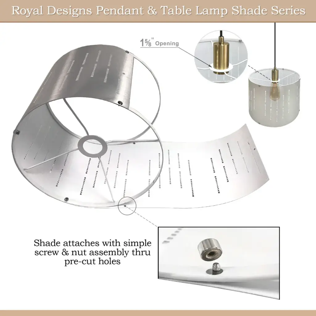 Royal Designs has been in the lampshade business since 1993 with its multiple shade lines that exemplify handcrafted quality and value. This Hardback lampshade is a part of Royal Designs, Inc. All hardback shade collections are perfect for indoor and outdoor. We have used silk-type shantung interior fabric with off-white hardback lining, also have used 0.5-inch washer, standard brass-finish spider lamp shade Fitter.Specification:Brand: Royal Designs, Inc.Type: DIY Hardback LampshadeMaterial: Polystyrene fabricShape: Shallow DrumColor: Polished Nickel / Polished Gold / Polished CopperSize: 8 x 8 x 8 inch / 10 x 10 x 8.5 inch / 12 x 12 x 9 inch / 14 x 14 x 10 inch / 16 x 16 x 10.5 inchMaximum Wattage: 100WDIMENSION: Our hardback lamp shade measures height 8 inches, top 8 inches, bottom 8 inches. Shades with 9"+ top diameter have a v-notch fitter for use with a 6" or 8" reflector bowl.DIMENSION: Our hardback lamp shade measures height 8.5 inches, top 10 inches, bottom 10 inches. Shades with 9"+ top diameter have a v-notch fitter for use with a 6" or 8" reflector bowl.DIMENSION: Our hardback lamp shade measures height 9 inches, top 12 inches, bottom 12 inches. Shades with 9"+ top diameter have a v-notch fitter for use with a 6" or 8" reflector bowl.DIMENSION: Our hardback lamp shade measures height 10 inches, top 14 inches, bottom 14 inches. Shades with 9"+ top diameter have a v-notch fitter for use with a 6" or 8" reflector bowl.DIMENSION: Our hardback lamp shade measures height 10.5 inches, top 16 inches, bottom 16 inches. Shades with 9"+ top diameter have a v-notch fitter for use with a 6" or 8" reflector bowl.MATERIAL: Made from polystyrene fabric and with a white interior and heavy grade rust-resistant 1.5mm metal frame that is thicker than the typical standard lamp shade. DIY LAMPSHADE KIT: Make a lampshade for any interior space with this DIY lampshade kit. It comes with top and bottom flat wireframes and assembly parts.CLEAN DESIGN: Our clean design Do It Yourself simple lampshade easily suits any interior space and decorative themes. The shade has a standard lampshade washer with a brass finish and a spider fitter or UNO fitter.APPLICATION: Quick and easy assembly knock-down style lampshade is suitable for table lamps, accent lamps, vintage lamps, candle stick lamps, and kid''s room lamps.