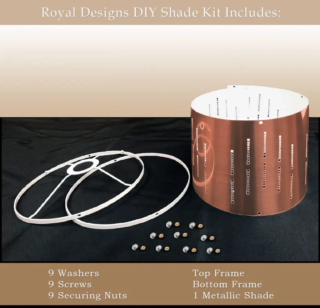 Royal Designs has been in the lampshade business since 1993 with its multiple shade lines that exemplify handcrafted quality and value. This Hardback lampshade is a part of Royal Designs, Inc. All hardback shade collections are perfect for indoor and outdoor. We have used silk-type shantung interior fabric with off-white hardback lining, also have used 0.5-inch washer, standard brass-finish spider lamp shade Fitter.Specification:Brand: Royal Designs, Inc.Type: DIY Hardback LampshadeMaterial: Polystyrene fabricShape: Shallow DrumColor: Polished Nickel / Polished Gold / Polished CopperSize: 8 x 8 x 8 inch / 10 x 10 x 8.5 inch / 12 x 12 x 9 inch / 14 x 14 x 10 inch / 16 x 16 x 10.5 inchMaximum Wattage: 100WDIMENSION: Our hardback lamp shade measures height 8 inches, top 8 inches, bottom 8 inches. Shades with 9"+ top diameter have a v-notch fitter for use with a 6" or 8" reflector bowl.DIMENSION: Our hardback lamp shade measures height 8.5 inches, top 10 inches, bottom 10 inches. Shades with 9"+ top diameter have a v-notch fitter for use with a 6" or 8" reflector bowl.DIMENSION: Our hardback lamp shade measures height 9 inches, top 12 inches, bottom 12 inches. Shades with 9"+ top diameter have a v-notch fitter for use with a 6" or 8" reflector bowl.DIMENSION: Our hardback lamp shade measures height 10 inches, top 14 inches, bottom 14 inches. Shades with 9"+ top diameter have a v-notch fitter for use with a 6" or 8" reflector bowl.DIMENSION: Our hardback lamp shade measures height 10.5 inches, top 16 inches, bottom 16 inches. Shades with 9"+ top diameter have a v-notch fitter for use with a 6" or 8" reflector bowl.MATERIAL: Made from polystyrene fabric and with a white interior and heavy grade rust-resistant 1.5mm metal frame that is thicker than the typical standard lamp shade. DIY LAMPSHADE KIT: Make a lampshade for any interior space with this DIY lampshade kit. It comes with top and bottom flat wireframes and assembly parts.CLEAN DESIGN: Our clean design Do It Yourself simple lampshade easily suits any interior space and decorative themes. The shade has a standard lampshade washer with a brass finish and a spider fitter or UNO fitter.APPLICATION: Quick and easy assembly knock-down style lampshade is suitable for table lamps, accent lamps, vintage lamps, candle stick lamps, and kid''s room lamps.
