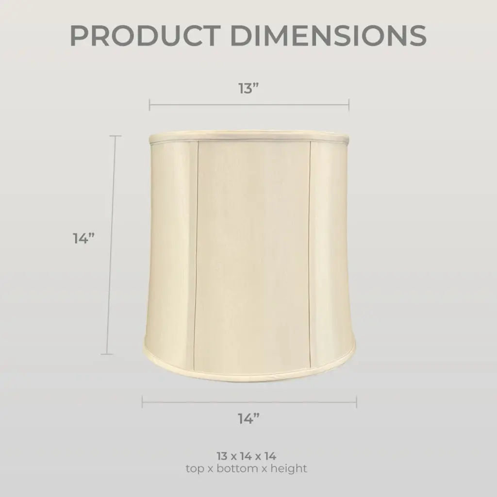 The Drum Lamp Shade is the most universal style of shade. The tall, round shape works well on most lamp bases and incorporates seamlessly into home decor. Made of tailored silk-type shantung fabric with an off-white softback lining (black shades have gold softback lining) to create a warm, soft glow. The Drum Lamp Shade is part of the Royal Designs, Inc. Timeless™ Basic Shade Collection. Royal Designs has been in the lampshade business since 1993 with our multiple shade lines that exemplify handcrafted quality and value. Height is measured by slant height from top to bottom of the lampshades"™ front face. Measurements listed as (Top Diameter x Bottom Diameter x Slant Height). Please measure your existing shade--a replacement harp may be needed for a proper fit or additional adjustment if changing the height of the shade.DIMENSION: Our traditional basic drum shade measures 9" x 10" x 10" (Top Diameter x Bottom Diamter x Slant Height)DIMENSION: Our traditional basic drum shade measures 11" x 13" x 13" (Top Diameter x Bottom Diamter x Slant Height)DIMENSION: Our traditional basic drum shade measures 13" x 14" x 14" (Top Diameter x Bottom Diamter x Slant Height)DIMENSION: Our traditional basic drum shade measures 14" x 15" x 15" (Top Diameter x Bottom Diamter x Slant Height)DIMENSION: Our traditional basic drum shade measures 15" x 16" x 16" (Top Diameter x Bottom Diamter x Slant Height)MATERIALS: Our classic lampshade is made from premium silk-type shantung fabric and sturdy off-white styrene lining.EASY TO USE: The standard spider fitter works with most lamps and is held in place by any final or cap.TRADITIONAL DESIGN: Works perfectly with floor lamps or tall table lamps with a small to medium base. Our shade will also fit in beautifully in transitional and modern home decors.APPLICATION: Use our lamp shade for table lamps, accent lamps, vintage lamps and even candlestick lamps! The timeless design is great for any room.