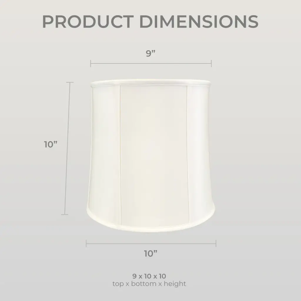 The Drum Lamp Shade is the most universal style of shade. The tall, round shape works well on most lamp bases and incorporates seamlessly into home decor. Made of tailored silk-type shantung fabric with an off-white softback lining (black shades have gold softback lining) to create a warm, soft glow. The Drum Lamp Shade is part of the Royal Designs, Inc. Timeless™ Basic Shade Collection. Royal Designs has been in the lampshade business since 1993 with our multiple shade lines that exemplify handcrafted quality and value. Height is measured by slant height from top to bottom of the lampshades"™ front face. Measurements listed as (Top Diameter x Bottom Diameter x Slant Height). Please measure your existing shade--a replacement harp may be needed for a proper fit or additional adjustment if changing the height of the shade.DIMENSION: Our traditional basic drum shade measures 9" x 10" x 10" (Top Diameter x Bottom Diamter x Slant Height)DIMENSION: Our traditional basic drum shade measures 11" x 13" x 13" (Top Diameter x Bottom Diamter x Slant Height)DIMENSION: Our traditional basic drum shade measures 13" x 14" x 14" (Top Diameter x Bottom Diamter x Slant Height)DIMENSION: Our traditional basic drum shade measures 14" x 15" x 15" (Top Diameter x Bottom Diamter x Slant Height)DIMENSION: Our traditional basic drum shade measures 15" x 16" x 16" (Top Diameter x Bottom Diamter x Slant Height)MATERIALS: Our classic lampshade is made from premium silk-type shantung fabric and sturdy off-white styrene lining.EASY TO USE: The standard spider fitter works with most lamps and is held in place by any final or cap.TRADITIONAL DESIGN: Works perfectly with floor lamps or tall table lamps with a small to medium base. Our shade will also fit in beautifully in transitional and modern home decors.APPLICATION: Use our lamp shade for table lamps, accent lamps, vintage lamps and even candlestick lamps! The timeless design is great for any room.