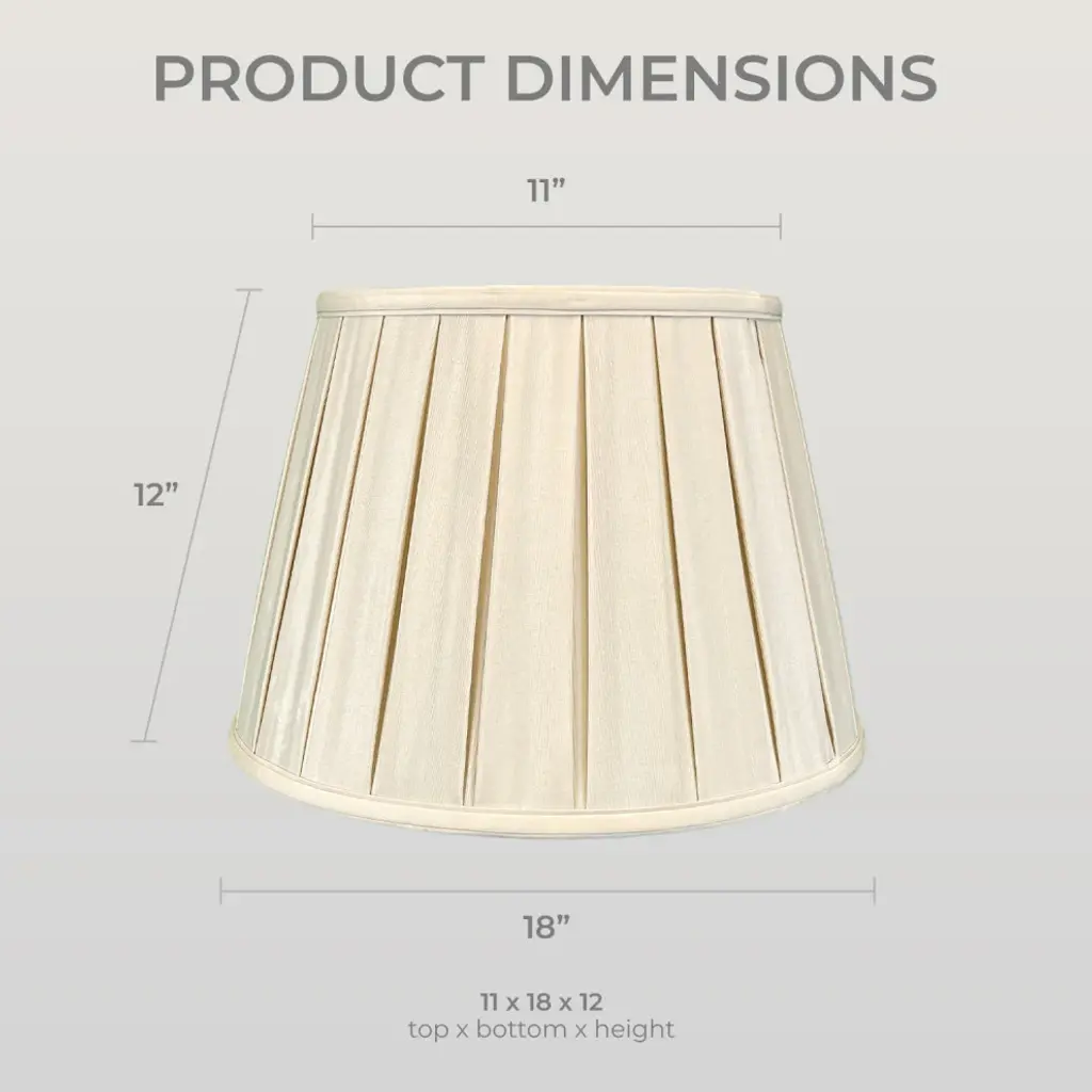 The Empire English Pleat Lamp Shade is a part of Royal Designs, Inc. Regal™ Basic Shade Collection. A classic lampshade with pleats, this shade is a traditional shape and style that will add sophistication to any space. This shade comes in a variety of colors and sizes. Perfect for updating or repairing an antique or cherished home lamp. Royal Designs has been in the lampshade business since 1993 with its multiple shade lines that exemplify handcrafted quality and value. Height is measured by slant height from top to bottom of the lampshades"™ front face. Measurements listed as (Top Diameter x Bottom Diameter x Slant Height). Please measure your existing shade--a replacement harp may be needed for a proper fit or additional adjustment if changing the height of the shade.DIMENSION: This English pleat empire shade measures 10" x 14.5" x 10" (Top Diameter x Bottom Diameter x Slant Height)DIMENSION: This English pleat empire shade measures 10.5" x 16" x 11" (Top Diameter x Bottom Diameter x Slant Height)DIMENSION: This English pleat empire shade measures 11" x 18" x 12" (Top Diameter x Bottom Diameter x Slant Height)MATERIALS: Our classic lampshade is made from premium silk-type shantung fabric and sturdy off-white styrene lining.EASY TO USE: The standard spider fitter works with most lamps and is held in place by any final or cap.TRADITIONAL DESIGN: Works perfectly with floor lamps or tall table lamps with a small to medium base. Our shade will also fit in beautifully in transitional and modern home decors.APPLICATION: Use our lamp shade for table lamps, accent lamps, vintage lamps, and even candlestick lamps! The timeless design is great for any room.