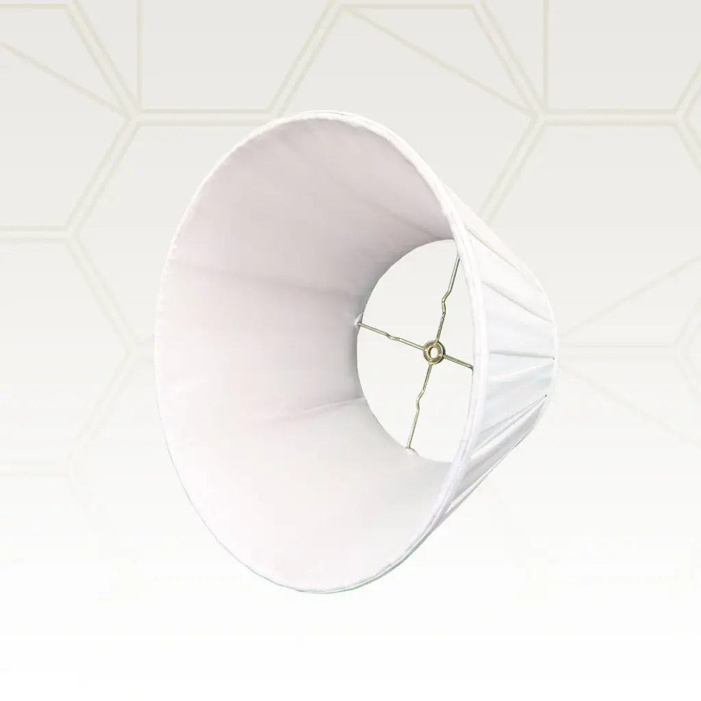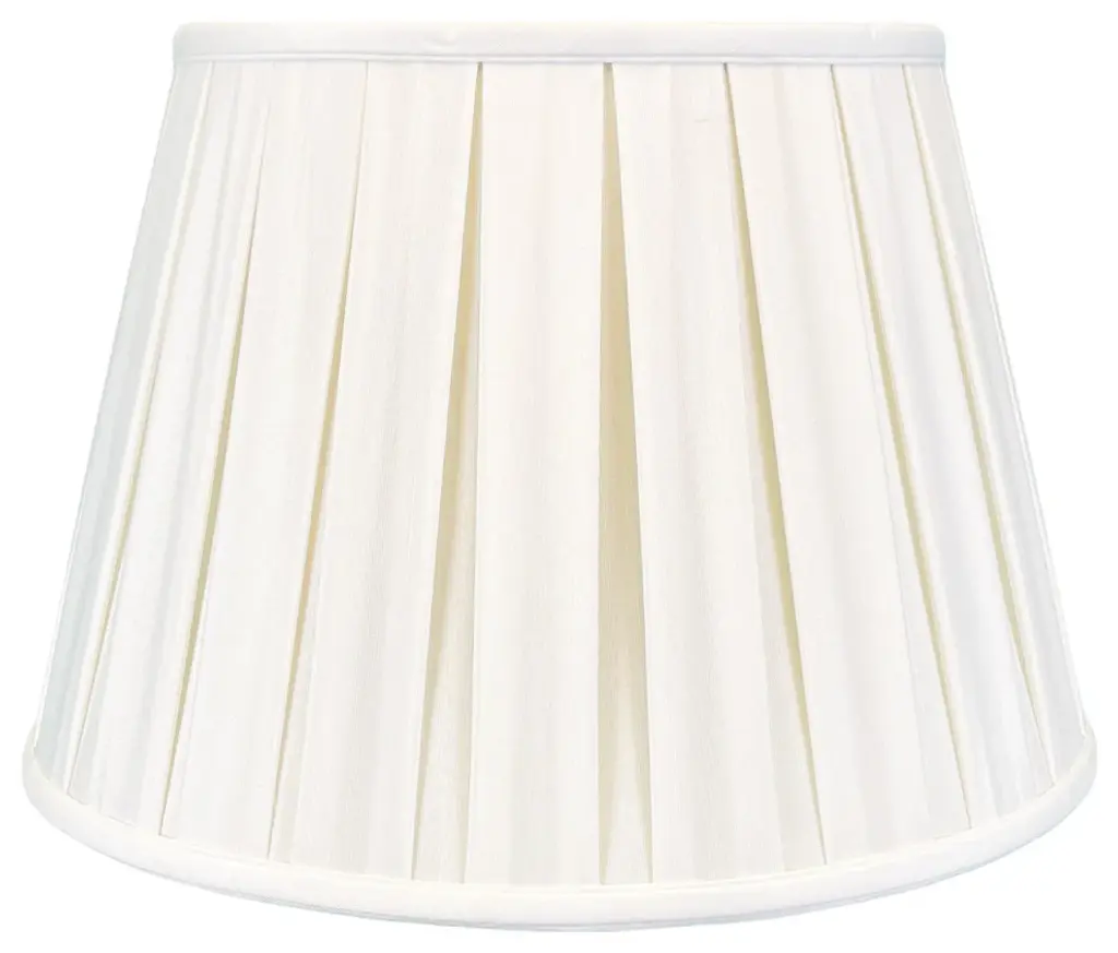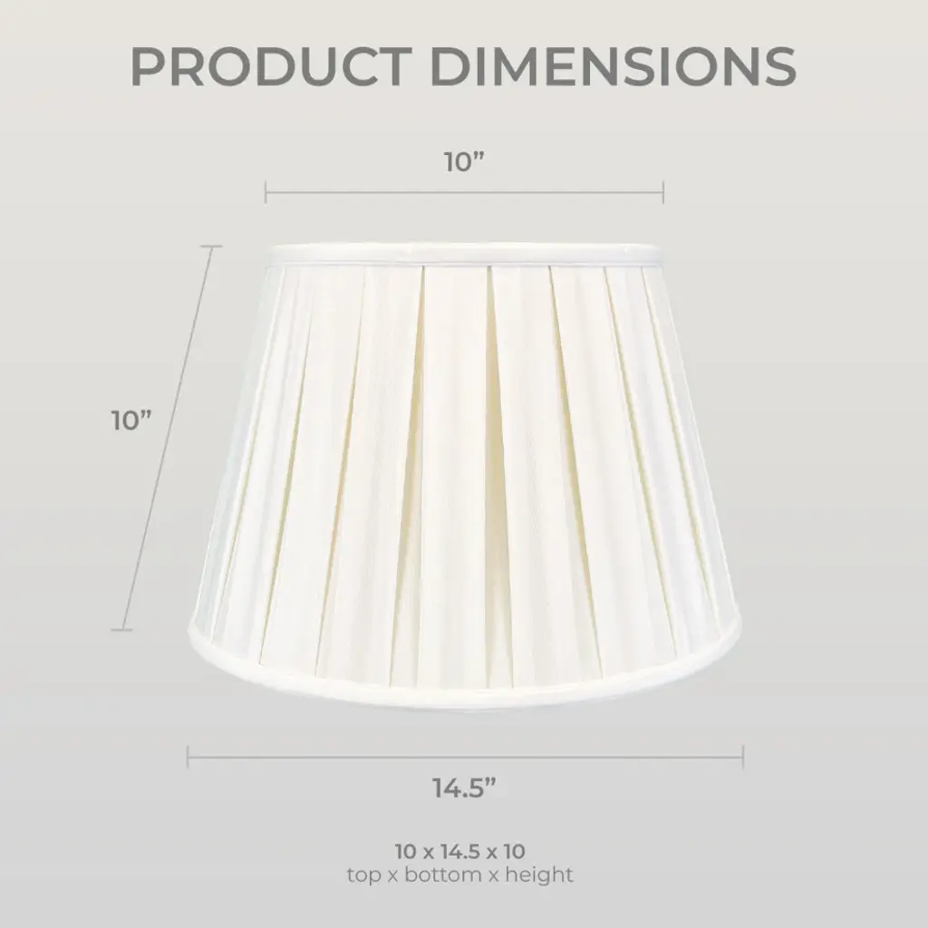 The Empire English Pleat Lamp Shade is a part of Royal Designs, Inc. Regal™ Basic Shade Collection. A classic lampshade with pleats, this shade is a traditional shape and style that will add sophistication to any space. This shade comes in a variety of colors and sizes. Perfect for updating or repairing an antique or cherished home lamp. Royal Designs has been in the lampshade business since 1993 with its multiple shade lines that exemplify handcrafted quality and value. Height is measured by slant height from top to bottom of the lampshades"™ front face. Measurements listed as (Top Diameter x Bottom Diameter x Slant Height). Please measure your existing shade--a replacement harp may be needed for a proper fit or additional adjustment if changing the height of the shade.DIMENSION: This English pleat empire shade measures 10" x 14.5" x 10" (Top Diameter x Bottom Diameter x Slant Height)DIMENSION: This English pleat empire shade measures 10.5" x 16" x 11" (Top Diameter x Bottom Diameter x Slant Height)DIMENSION: This English pleat empire shade measures 11" x 18" x 12" (Top Diameter x Bottom Diameter x Slant Height)MATERIALS: Our classic lampshade is made from premium silk-type shantung fabric and sturdy off-white styrene lining.EASY TO USE: The standard spider fitter works with most lamps and is held in place by any final or cap.TRADITIONAL DESIGN: Works perfectly with floor lamps or tall table lamps with a small to medium base. Our shade will also fit in beautifully in transitional and modern home decors.APPLICATION: Use our lamp shade for table lamps, accent lamps, vintage lamps, and even candlestick lamps! The timeless design is great for any room.
