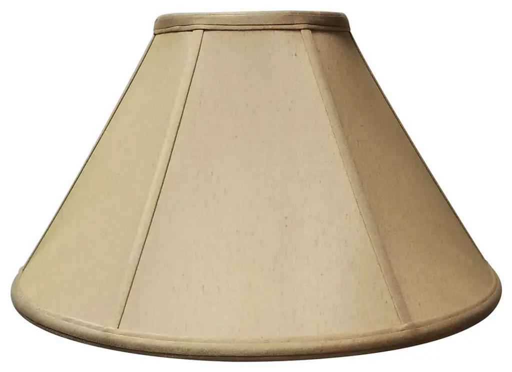 The Coolie Empire Lamp Shade gets its name from traditional Asian conical hats, which have a wide bottom and narrow top. You''ll find the Coolie style shades on large lamp bases to help create contrast and balance. This shade comes in a variety of fabrics and color options, and is perfect for creating a modern, contemporary look. The Coolie Empire Lamp Shade is part of the Royal Designs, Inc. Timeless™ Basic Shade Collection. Royal Designs has been in the lamp shade business since 1993 with our multiple shade lines that exemplify handcrafted quality and value. Height is measured by slant height from top to bottom of the lampshades"™ front face. Measurements listed as (TOP x BOTTOM x HEIGHT). Please measure your existing shade--a replacement harp may be needed for a proper fit or additional adjustment if changing height of shade. Exterior Fabric: Hand Tailored Silk-Type Shantung (except Linen, Mouton, Burlap & Faux Rawhide fabrics) Interior Fabric: Off-White Softback Lining (Black, Burlap & Faux Rawhide fabrics have gold lining) Washer: Standard brass-finish spider fitter, use a finial to fasten shade. (Shades with 9"+ top diameter have a V-Notch fitter for use with a 6" or 8" reflector bowl)Trim: Top and bottom trim (single or double) with vertical piping Frame: Heavy grade rust resistant metal frame Bulb: Suggested maximum wattage is 150-watt for most sizesHeight is measured by slant height from top to bottom of the lampshadesfront facePlease measure your existing shade--a replacement harp may be needed for a proper fit or additional adjustment if changing height of shade.