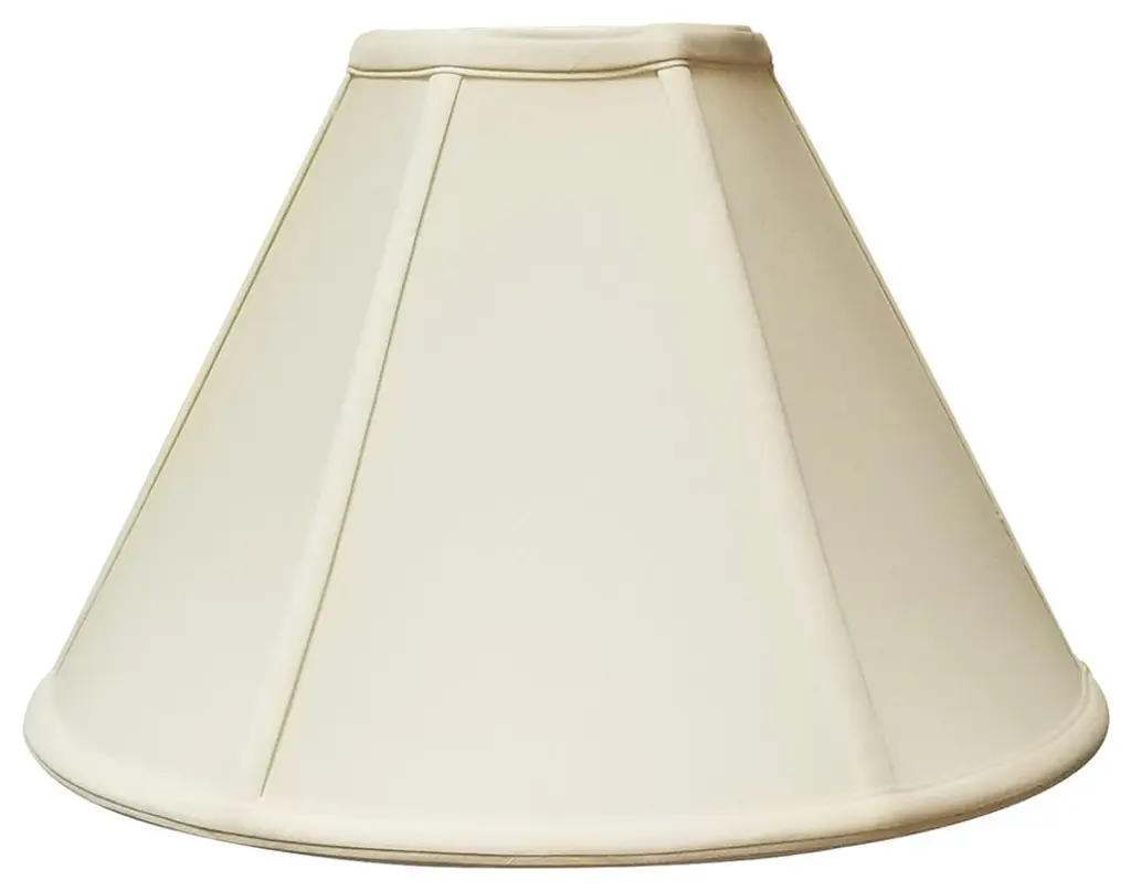 The Coolie Empire Lamp Shade gets its name from traditional Asian conical hats, which have a wide bottom and narrow top. You''ll find the Coolie style shades on large lamp bases to help create contrast and balance. This shade comes in a variety of fabrics and color options, and is perfect for creating a modern, contemporary look. The Coolie Empire Lamp Shade is part of the Royal Designs, Inc. Timeless™ Basic Shade Collection. Royal Designs has been in the lamp shade business since 1993 with our multiple shade lines that exemplify handcrafted quality and value. Height is measured by slant height from top to bottom of the lampshades"™ front face. Measurements listed as (TOP x BOTTOM x HEIGHT). Please measure your existing shade--a replacement harp may be needed for a proper fit or additional adjustment if changing height of shade. Exterior Fabric: Hand Tailored Silk-Type Shantung (except Linen, Mouton, Burlap & Faux Rawhide fabrics) Interior Fabric: Off-White Softback Lining (Black, Burlap & Faux Rawhide fabrics have gold lining) Washer: Standard brass-finish spider fitter, use a finial to fasten shade. (Shades with 9"+ top diameter have a V-Notch fitter for use with a 6" or 8" reflector bowl)Trim: Top and bottom trim (single or double) with vertical piping Frame: Heavy grade rust resistant metal frame Bulb: Suggested maximum wattage is 150-watt for most sizesHeight is measured by slant height from top to bottom of the lampshadesfront facePlease measure your existing shade--a replacement harp may be needed for a proper fit or additional adjustment if changing height of shade.