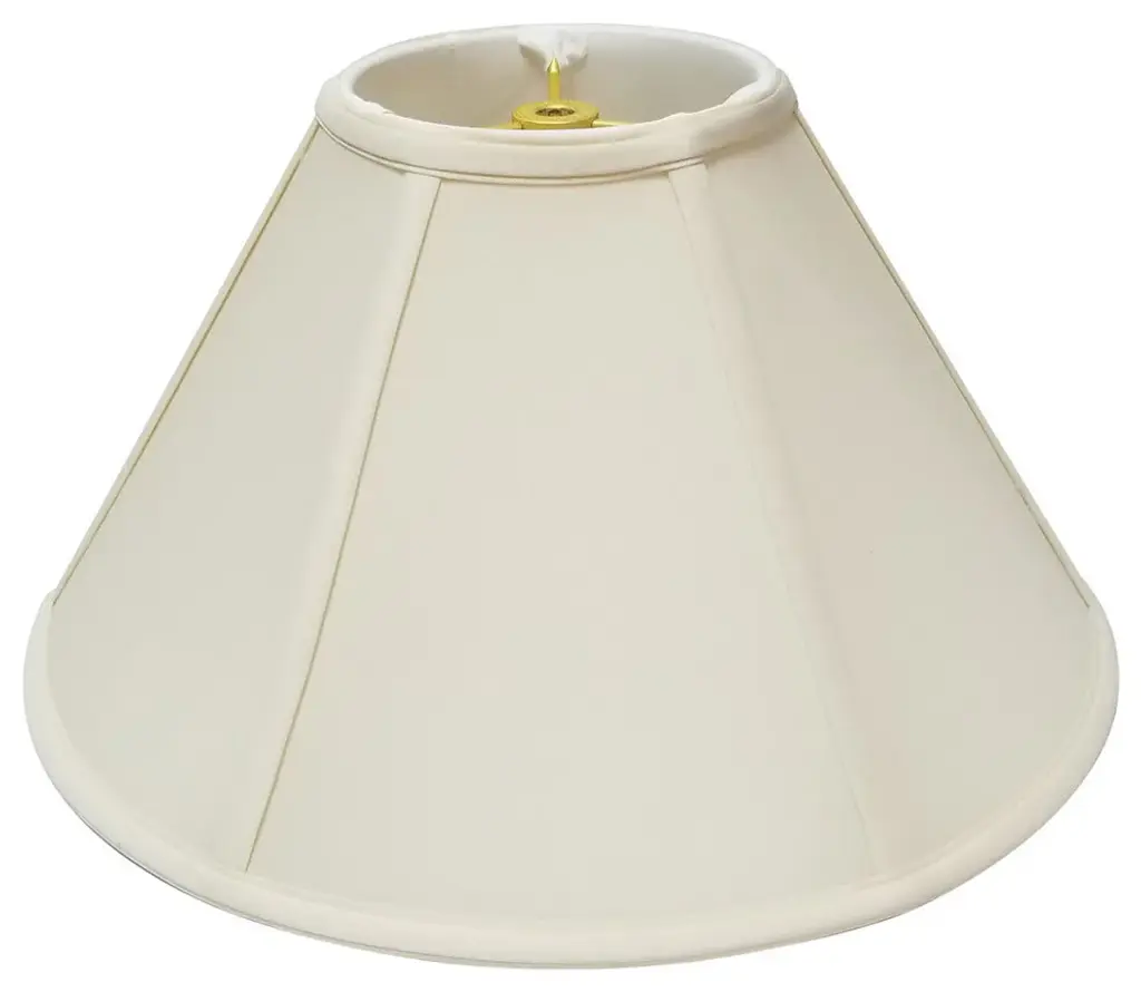 The Coolie Empire Lamp Shade gets its name from traditional Asian conical hats, which have a wide bottom and narrow top. You''ll find the Coolie style shades on large lamp bases to help create contrast and balance. This shade comes in a variety of fabrics and color options, and is perfect for creating a modern, contemporary look. The Coolie Empire Lamp Shade is part of the Royal Designs, Inc. Timeless™ Basic Shade Collection. Royal Designs has been in the lamp shade business since 1993 with our multiple shade lines that exemplify handcrafted quality and value. Height is measured by slant height from top to bottom of the lampshades"™ front face. Measurements listed as (TOP x BOTTOM x HEIGHT). Please measure your existing shade--a replacement harp may be needed for a proper fit or additional adjustment if changing height of shade. Exterior Fabric: Hand Tailored Silk-Type Shantung (except Linen, Mouton, Burlap & Faux Rawhide fabrics) Interior Fabric: Off-White Softback Lining (Black, Burlap & Faux Rawhide fabrics have gold lining) Washer: Standard brass-finish spider fitter, use a finial to fasten shade. (Shades with 9"+ top diameter have a V-Notch fitter for use with a 6" or 8" reflector bowl)Trim: Top and bottom trim (single or double) with vertical piping Frame: Heavy grade rust resistant metal frame Bulb: Suggested maximum wattage is 150-watt for most sizesHeight is measured by slant height from top to bottom of the lampshadesfront facePlease measure your existing shade--a replacement harp may be needed for a proper fit or additional adjustment if changing height of shade.