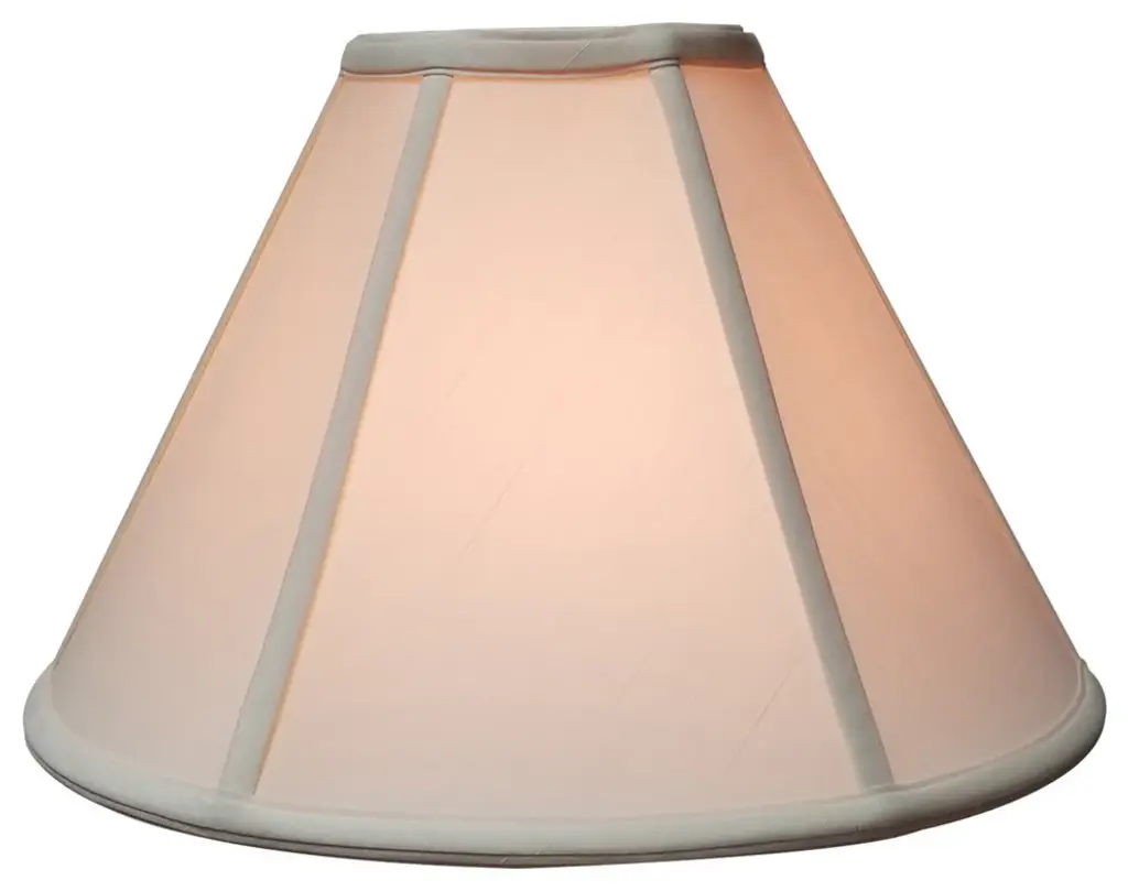 The Coolie Empire Lamp Shade gets its name from traditional Asian conical hats, which have a wide bottom and narrow top. You''ll find the Coolie style shades on large lamp bases to help create contrast and balance. This shade comes in a variety of fabrics and color options, and is perfect for creating a modern, contemporary look. The Coolie Empire Lamp Shade is part of the Royal Designs, Inc. Timeless™ Basic Shade Collection. Royal Designs has been in the lamp shade business since 1993 with our multiple shade lines that exemplify handcrafted quality and value. Height is measured by slant height from top to bottom of the lampshades"™ front face. Measurements listed as (TOP x BOTTOM x HEIGHT). Please measure your existing shade--a replacement harp may be needed for a proper fit or additional adjustment if changing height of shade. Exterior Fabric: Hand Tailored Silk-Type Shantung (except Linen, Mouton, Burlap & Faux Rawhide fabrics) Interior Fabric: Off-White Softback Lining (Black, Burlap & Faux Rawhide fabrics have gold lining) Washer: Standard brass-finish spider fitter, use a finial to fasten shade. (Shades with 9"+ top diameter have a V-Notch fitter for use with a 6" or 8" reflector bowl)Trim: Top and bottom trim (single or double) with vertical piping Frame: Heavy grade rust resistant metal frame Bulb: Suggested maximum wattage is 150-watt for most sizesHeight is measured by slant height from top to bottom of the lampshadesfront facePlease measure your existing shade--a replacement harp may be needed for a proper fit or additional adjustment if changing height of shade.