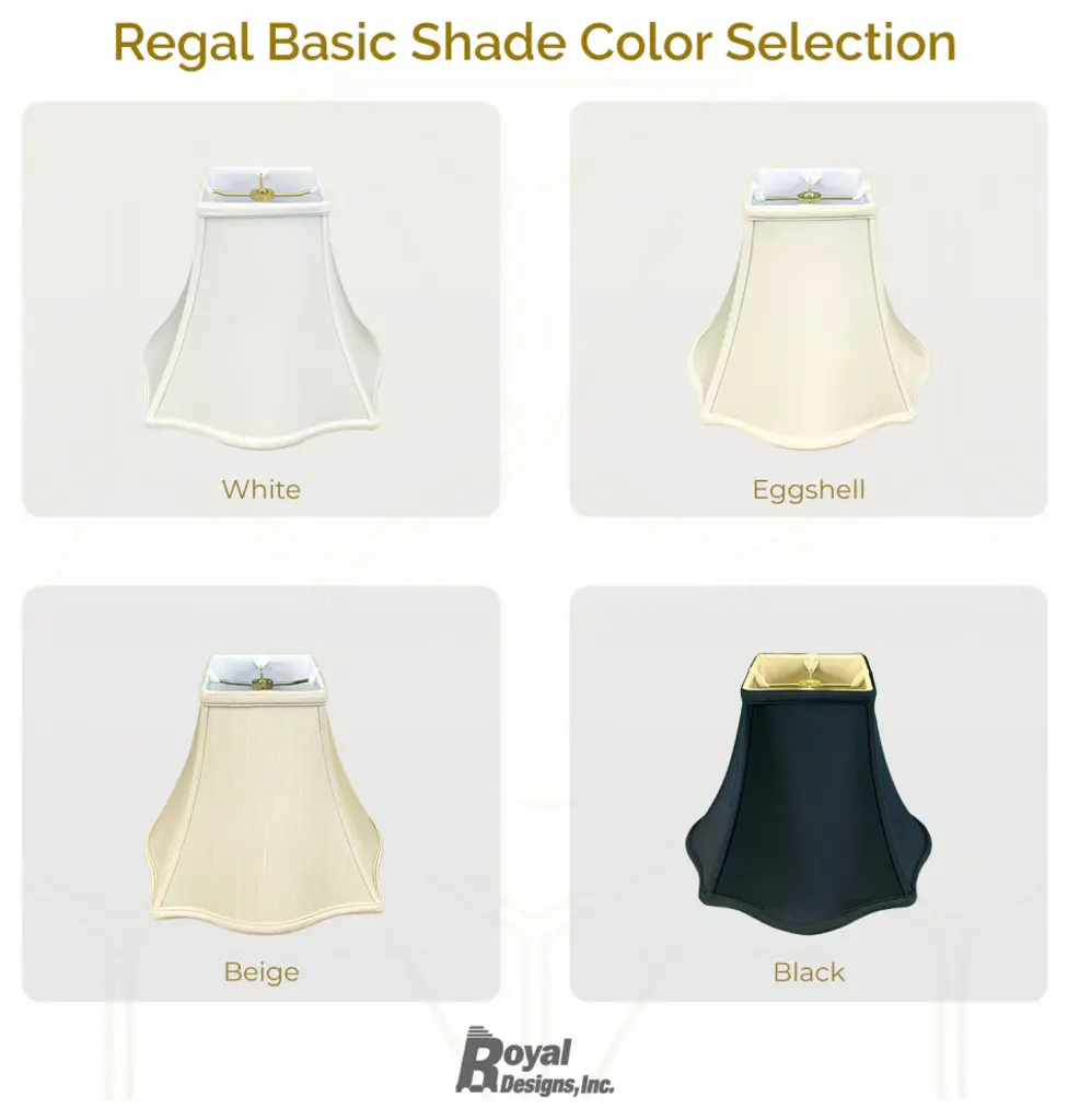 The Fancy Square Bell Basic Lamp Shade is part of the Royal Designs, Inc. Timeless Basic Shade Collection and is a traditional yet stunning way to finish the look of your lamp. Our fancy lampshade makes a subtle statement and will turn your floor lamp or table lamp into a talking piece. We have decades of experience in the business of lampshades and we''re proud to offer multiple product lines that exemplify handcrafted quality and value. Be sure to browse our vast collection of shades in a wide variety of distinctive shapes that will add a new level of sophistication to your lighting and home decor.Height is measured on the slant from the top to the bottom of the lamp shade''s front face.DIMENSION: Our traditional basic fancy square bell lamp shade measures 4" x 10" x 8.5" (Top Diameter x Bottom Diameter x Slant Height)DIMENSION: Our traditional basic fancy square bell lamp shade measures 5" x 12" x 9.75" (Top Diameter x Bottom Diameter x Slant Height)DIMENSION: Our traditional basic fancy square bell lamp shade measures 6" x 14" x 11.5" (Top Diameter x Bottom Diameter x Slant Height)DIMENSION: Our traditional basic fancy square bell lamp shade measures 7" x 16" x 12.75" (Top Diameter x Bottom Diameter x Slant Height)MATERIALS: Our classic lampshade is made from premium silk-type shantung fabric and sturdy off-white styrene lining.EASY TO USE: The standard spider fitter works with most lamps and is held in place by any final or cap.TRADITIONAL DESIGN: Works perfectly with floor lamps or tall table lamps with a small to medium base. Our shade will also fit in beautifully in transitional and modern home decors.APPLICATION: Use our lamp shade for table lamps, accent lamps, vintage lamps, and even candlestick lamps! The timeless design is great for any room.Specification:Brand: Royal Designs, Inc.Type: Bell Lamp ShadeMaterial: FabricShape: Bell