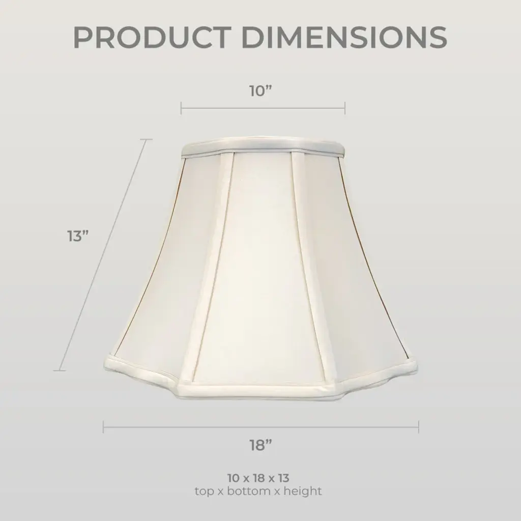 The Flare Corner Basic Lamp Shade is part of the Royal Designs, Inc. Timeless Basic Shade Collection and is a traditional yet stunning way to finish the look of your lamp. Our fancy lampshade makes a subtle statement and will turn your floor lamp or table lamp into a talking piece. We have decades of experience in the business of lampshades and we''re proud to offer multiple product lines that exemplify handcrafted quality and value. Be sure to browse our vast collection of shades in a wide variety of distinctive shapes that will add a new level of sophistication to your lighting and home decor.Height is measured on the slant from the top to the bottom of the lamp shade''s front face.DIMENSION: Our traditional basic corner scalloped lamp shade measures 6.5" x 12" x 9.25" (Top Diameter x Bottom Diameter x Slant Height)DIMENSION: Our traditional basic corner scalloped lamp shade measures 8" x 14" x 11" (Top Diameter x Bottom Diameter x Slant Height)DIMENSION: Our traditional basic corner scalloped lamp shade measures 9" x 16" x 12" (Top Diameter x Bottom Diameter x Slant Height)DIMENSION: Our traditional basic corner scalloped lamp shade measures 10" x 18" x 13" (Top Diameter x Bottom Diameter x Slant Height)MATERIALS: Our classic lampshade is made from premium silk-type shantung fabric and sturdy off-white styrene lining.EASY TO USE: The standard spider fitter works with most lamps and is held in place by any final or cap.TRADITIONAL DESIGN: Works perfectly with floor lamps or tall table lamps with a small to medium base. Our shade will also fit in beautifully in transitional and modern home decors.APPLICATION: Use our lamp shade for table lamps, accent lamps, vintage lamps, and even candlestick lamps! The timeless design is great for any room.Specification:Brand: Royal Designs, Inc.Type: Scalloped Lamp ShadeMaterial: FabricShape: ScallopedFinish: Antique