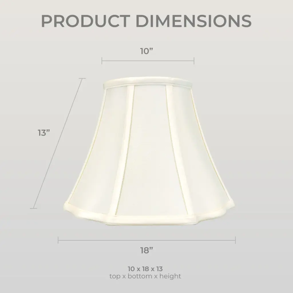 The Flare Corner Basic Lamp Shade is part of the Royal Designs, Inc. Timeless Basic Shade Collection and is a traditional yet stunning way to finish the look of your lamp. Our fancy lampshade makes a subtle statement and will turn your floor lamp or table lamp into a talking piece. We have decades of experience in the business of lampshades and we''re proud to offer multiple product lines that exemplify handcrafted quality and value. Be sure to browse our vast collection of shades in a wide variety of distinctive shapes that will add a new level of sophistication to your lighting and home decor.Height is measured on the slant from the top to the bottom of the lamp shade''s front face.DIMENSION: Our traditional basic corner scalloped lamp shade measures 6.5" x 12" x 9.25" (Top Diameter x Bottom Diameter x Slant Height)DIMENSION: Our traditional basic corner scalloped lamp shade measures 8" x 14" x 11" (Top Diameter x Bottom Diameter x Slant Height)DIMENSION: Our traditional basic corner scalloped lamp shade measures 9" x 16" x 12" (Top Diameter x Bottom Diameter x Slant Height)DIMENSION: Our traditional basic corner scalloped lamp shade measures 10" x 18" x 13" (Top Diameter x Bottom Diameter x Slant Height)MATERIALS: Our classic lampshade is made from premium silk-type shantung fabric and sturdy off-white styrene lining.EASY TO USE: The standard spider fitter works with most lamps and is held in place by any final or cap.TRADITIONAL DESIGN: Works perfectly with floor lamps or tall table lamps with a small to medium base. Our shade will also fit in beautifully in transitional and modern home decors.APPLICATION: Use our lamp shade for table lamps, accent lamps, vintage lamps, and even candlestick lamps! The timeless design is great for any room.Specification:Brand: Royal Designs, Inc.Type: Scalloped Lamp ShadeMaterial: FabricShape: ScallopedFinish: Antique