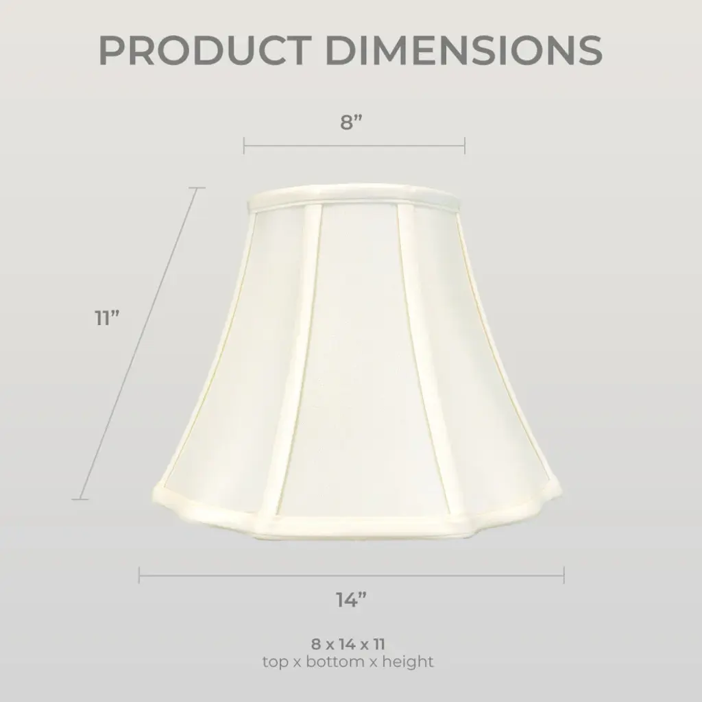 The Flare Corner Basic Lamp Shade is part of the Royal Designs, Inc. Timeless Basic Shade Collection and is a traditional yet stunning way to finish the look of your lamp. Our fancy lampshade makes a subtle statement and will turn your floor lamp or table lamp into a talking piece. We have decades of experience in the business of lampshades and we''re proud to offer multiple product lines that exemplify handcrafted quality and value. Be sure to browse our vast collection of shades in a wide variety of distinctive shapes that will add a new level of sophistication to your lighting and home decor.Height is measured on the slant from the top to the bottom of the lamp shade''s front face.DIMENSION: Our traditional basic corner scalloped lamp shade measures 6.5" x 12" x 9.25" (Top Diameter x Bottom Diameter x Slant Height)DIMENSION: Our traditional basic corner scalloped lamp shade measures 8" x 14" x 11" (Top Diameter x Bottom Diameter x Slant Height)DIMENSION: Our traditional basic corner scalloped lamp shade measures 9" x 16" x 12" (Top Diameter x Bottom Diameter x Slant Height)DIMENSION: Our traditional basic corner scalloped lamp shade measures 10" x 18" x 13" (Top Diameter x Bottom Diameter x Slant Height)MATERIALS: Our classic lampshade is made from premium silk-type shantung fabric and sturdy off-white styrene lining.EASY TO USE: The standard spider fitter works with most lamps and is held in place by any final or cap.TRADITIONAL DESIGN: Works perfectly with floor lamps or tall table lamps with a small to medium base. Our shade will also fit in beautifully in transitional and modern home decors.APPLICATION: Use our lamp shade for table lamps, accent lamps, vintage lamps, and even candlestick lamps! The timeless design is great for any room.Specification:Brand: Royal Designs, Inc.Type: Scalloped Lamp ShadeMaterial: FabricShape: ScallopedFinish: Antique