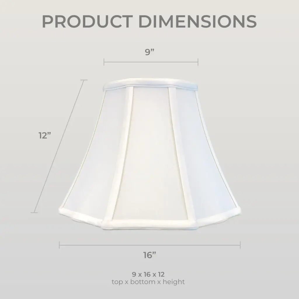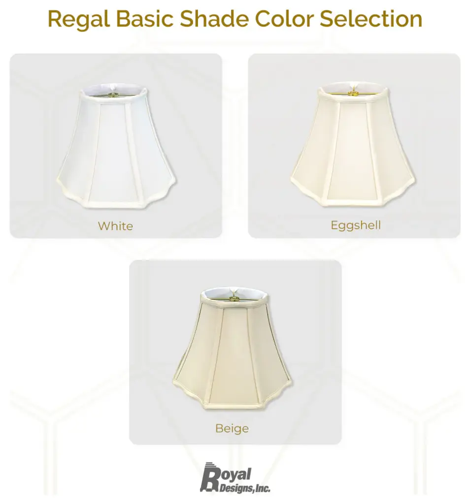 The Flare Corner Basic Lamp Shade is part of the Royal Designs, Inc. Timeless Basic Shade Collection and is a traditional yet stunning way to finish the look of your lamp. Our fancy lampshade makes a subtle statement and will turn your floor lamp or table lamp into a talking piece. We have decades of experience in the business of lampshades and we''re proud to offer multiple product lines that exemplify handcrafted quality and value. Be sure to browse our vast collection of shades in a wide variety of distinctive shapes that will add a new level of sophistication to your lighting and home decor.Height is measured on the slant from the top to the bottom of the lamp shade''s front face.DIMENSION: Our traditional basic corner scalloped lamp shade measures 6.5" x 12" x 9.25" (Top Diameter x Bottom Diameter x Slant Height)DIMENSION: Our traditional basic corner scalloped lamp shade measures 8" x 14" x 11" (Top Diameter x Bottom Diameter x Slant Height)DIMENSION: Our traditional basic corner scalloped lamp shade measures 9" x 16" x 12" (Top Diameter x Bottom Diameter x Slant Height)DIMENSION: Our traditional basic corner scalloped lamp shade measures 10" x 18" x 13" (Top Diameter x Bottom Diameter x Slant Height)MATERIALS: Our classic lampshade is made from premium silk-type shantung fabric and sturdy off-white styrene lining.EASY TO USE: The standard spider fitter works with most lamps and is held in place by any final or cap.TRADITIONAL DESIGN: Works perfectly with floor lamps or tall table lamps with a small to medium base. Our shade will also fit in beautifully in transitional and modern home decors.APPLICATION: Use our lamp shade for table lamps, accent lamps, vintage lamps, and even candlestick lamps! The timeless design is great for any room.Specification:Brand: Royal Designs, Inc.Type: Scalloped Lamp ShadeMaterial: FabricShape: ScallopedFinish: Antique