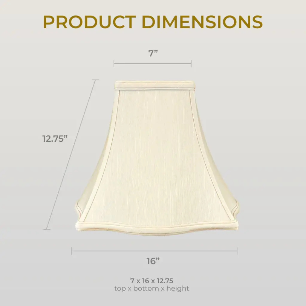 Royal Designs has been in the lamp shade business since 1993 with their multiple shade lines that exemplify handcrafted quality and value. Our basic lamp shades collection is perfect for anyone looking for simple yet stunning lamp shades. The lamp shades are available in a variety of shapes, sizes, colors, and styles. Our basic shades will blend into your home or office interiors and act as an intriguing decor piece. Take a pick from our Cut-corner or the elegant V-notch style, to add the touch of the appealing atmosphere for either reading, romance, or dining.DIMENSION: Our modern silk lamp shade measures top 7 inch, bottom 16 inch, height 12.25 inch.MATERIALS: Made from silk-type shantung fabric and premium off-white styrene lining for these classic lamp shade.EASY TO USE: Fastest way to install our basic lamp shade and decor your home.ELEGANT DESIGN: Fancy design floor lamp shade creates an elongated look and works well for tall lamps with a small to medium base. Also, fit with transitional and modern homes.APPLICATION: Modern lamp shade is suitable for table lamps, accent lamps, vintage lamps, candle stick lamps and kid''s room lamps.