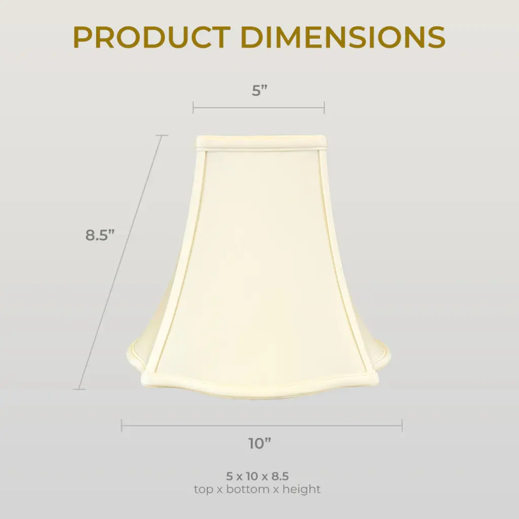 This Flare Bottom Outside Corner bell lamp shade is a part of Royal Designs, Inc. Royal Designs has been in the lamp shade business since 1993 with their multiple shade lines that exemplify handcrafted quality and value. Our basic lamp shades collection is perfect for anyone looking for simple yet stunning lamp shades. The lamp shades are available in a variety of shapes, sizes, colors, and styles. Our basic shades will blend into your home or office interiors and act as an intriguing decor piece. Take a pick from our Cut-corner or the elegant V-notch style, to add the touch of the appealing atmosphere for either reading, romance, or dining.DIMENSION: Our modern silk lamp shade measures top 4 inch, bottom 10 inch, height 8.5 inch.MATERIALS: Made from silk-type shantung fabric and premium off-white styrene lining for these classic lamp shade.EASY TO USE: Fastest way to install our basic lamp shade and decor your home.ELEGANT DESIGN: Fancy design floor lamp shade creates an elongated look and works well for tall lamps with a small to medium base. Also, fit with transitional and modern homes.APPLICATION: Modern lamp shade is suitable for table lamps, accent lamps, vintage lamps, candle stick lamps and kid''s room lamps.