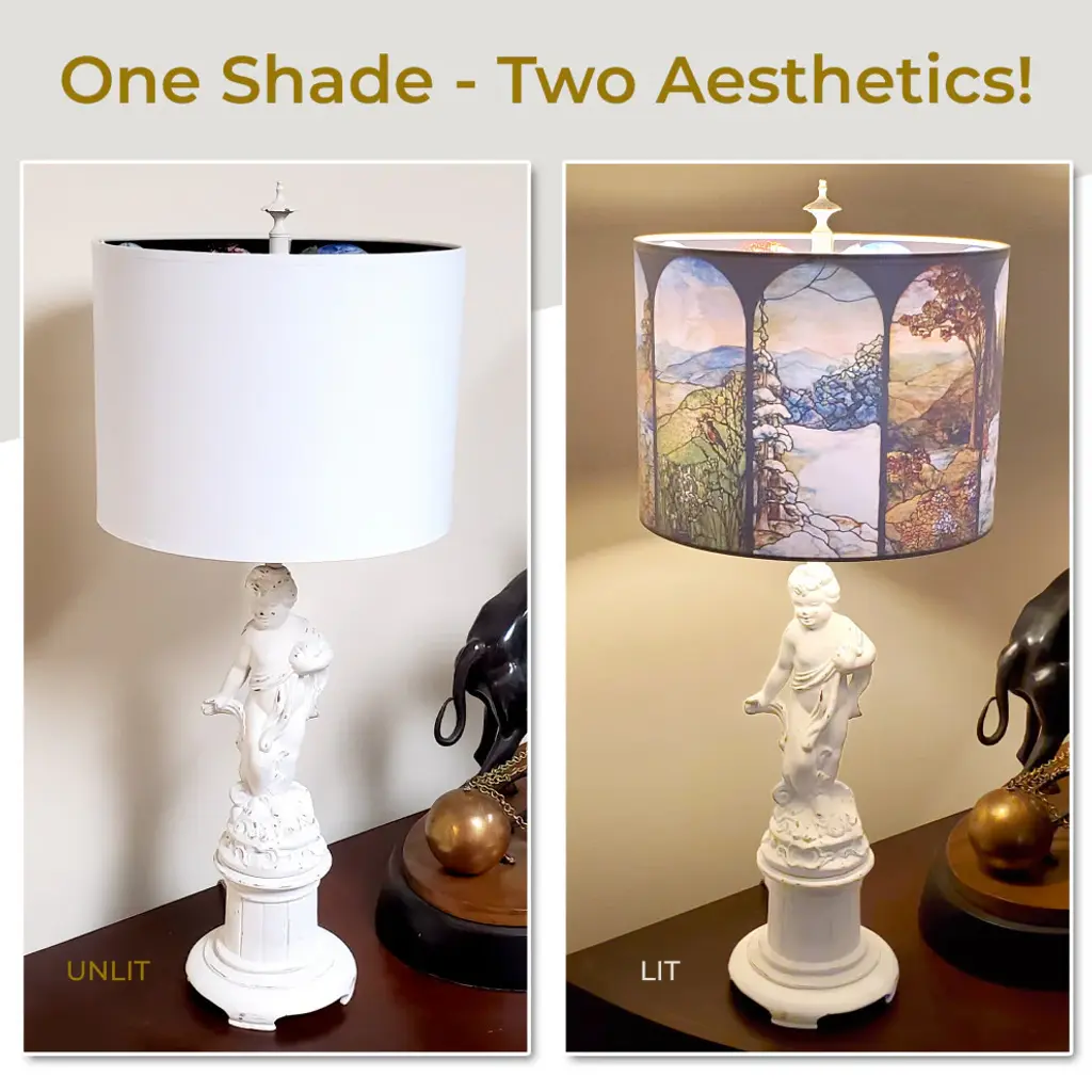 SHAPE and DIMENSIONS: This shallow drum hardback shade is measured as (Top Diameter x Bottom Diameter x Slant Height) and comes in the following sizes:10 x 10 x 812 x 12 x 8.514 x 14 x 9SHINE-THROUGH DESIGN: The understated white exterior shows the design of the interior lining when lit, offering a unique silhouette effect that is sure to amaze!WASHER: Standard (0.5-inch recess) brass-finish spider fitter w/ trademark stamping. (Shades with 9-inch+ top diameter have a V-Notch fitter for use with a 6-inch or 8-inch reflector bowl)FRAME: Our heavy-grade rust-resistant metal frame is thicker than typical lampshade frames, giving it a superior structure that will help it last for years.QUALITY MATTERS: This shade design is printed on high-quality hardback polystyrene material at a state-of-the-art printing facility. Made in the U.S.A.